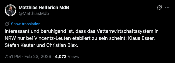 Der radikale Dortmunder AfD-Bundestagskandidat Matthias Helferich versucht diese Enthüllungen für sich zu nutzen. Auf der Plattform X schreibt er: „Interessant und beruhigend ist, dass das Vetternwirtschaftssystem in NRW nur bei Vincentz-Leuten etabliert zu sein scheint: Klaus Esser, Stefan Keuter und Christian Blex.“