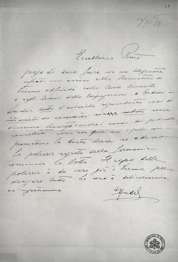 Der Vatikan baute nicht nur ein Geheimarchiv mit den Missbrauchsakten auf, sondern ordnete sogar die Vernichtung von sensiblen Unterlagen an. Das belegt eine Weisung aus dem Vatikan nach Wien von 1938, kurz nach dem Einmarsch Hitlers in Österreich: Akten über sexuellen Missbrauch an Kindern sollten verbrannt werden, offenbar aus Furcht, das Material könnte den Nationalsozialisten in die Hände fallen. Der handschriftliche Befehl verließ Rom nie; er wurde nur dem Überbringer der Nachricht nach Österreich gezeigt. Bemerkenswert ist: Die handschriftliche Anordnung weist keine Protokollnummer auf. Diese Dokumente wurden, angestoßen von der CORRECTIV-Recherche, durch den Historiker Davide Jabes analysiert. (Lesen Sie hier eine exklusive Einordnung zu dem Fund.)