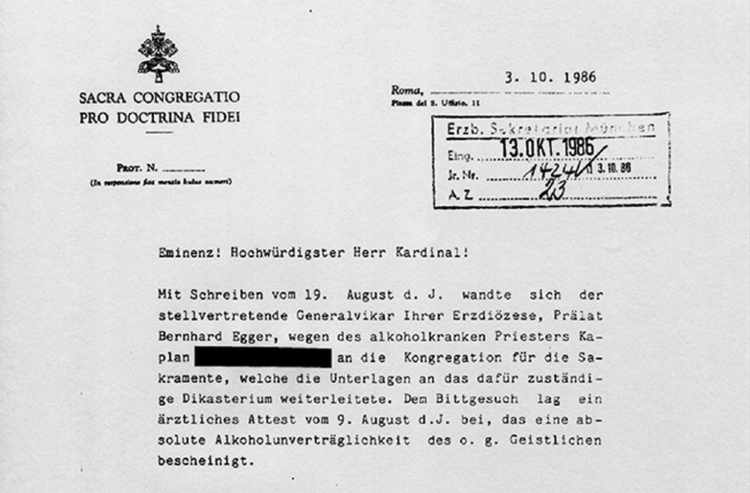 - 1985: Nach mehrmaligem Nachfragen kommt eine Antwort von Kardinal Ratzinger: Trotz aller guten Gründe, den Mann zu entlassen, benötige das Dikasterium mehr Zeit, um darüber zu entscheiden. Man müsse das junge Alter des Priesters mitbedenken, ihn jetzt zu entlassen, könne dem Wohl der Gesamtkirche schaden.