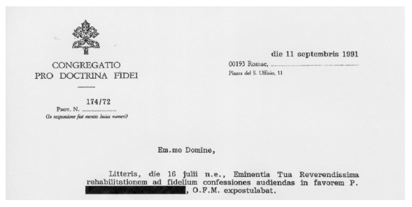 - Juli 1989: Antwort des Dikasteriums durch Kardinal Ratzinger: Solange der Priester nicht selbst darum bittet, kann Dikasterium nichts machen, Verweis auf Strafnormen im CIC