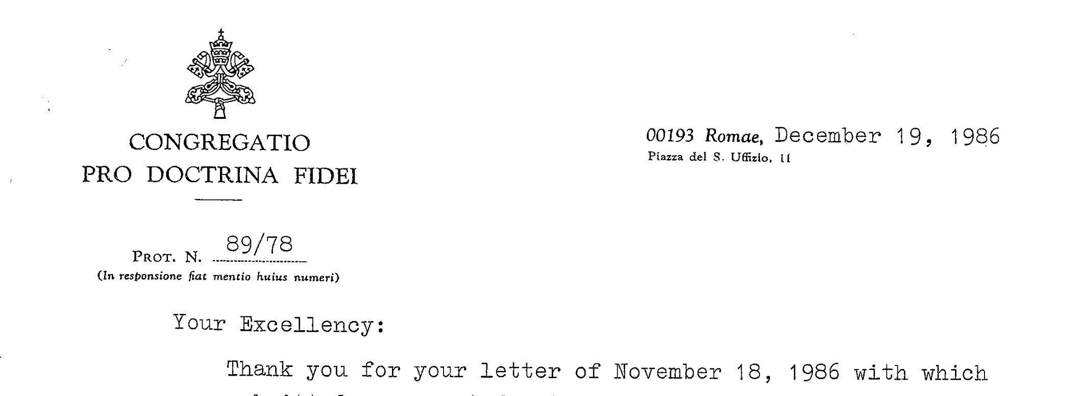 Die Protokollnummer weist daraufhin, dass der Fall bereits seit 1978 der Glaubenskongregation vorliegt. Der Grund lässt sich den Akten nicht entnehmen. Der Bischof bat erst 1986 um eine Erlaubnis für Traubensaft.