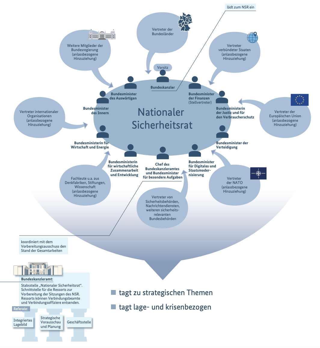 Mitglieder sind neben dem Bundeskanzler und dem Chef des Kanzleramtes die Ministerinnen und Minister für Finanzen, Verteidigung, Inneres, Auswärtiges, Justiz, Digitales, Wirtschaft sowie Entwicklung. Auch Gäste können geladen werden, etwa von Nachrichtendiensten, Bundeswehr, NATO, oder anderen Behörden.