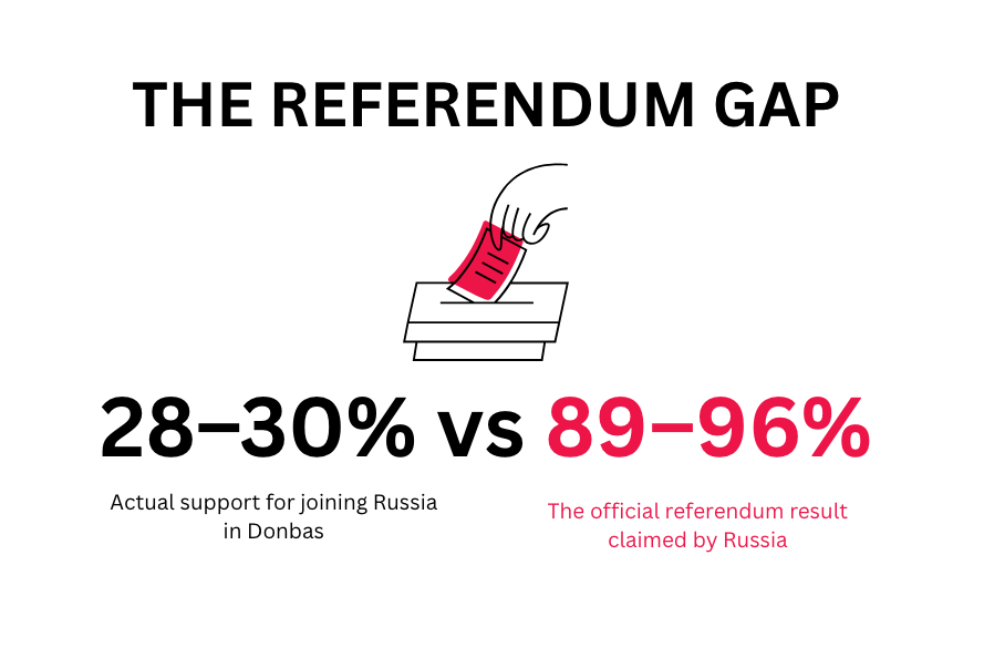 A month before those referendums, the Kyiv International Institute of Sociology surveyed the same population. It found that 28 percent of Donetsk residents and 30 percent of Luhansk residents supported joining Russia. The gap between those two numbers — roughly 60 percentage points — is not a footnote. It is the fact around which this entire story turns.