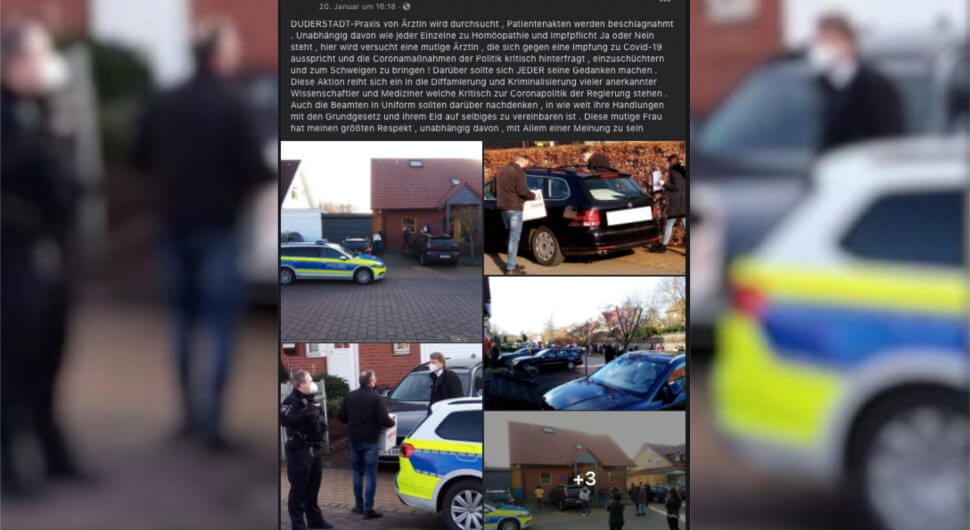 Auf Facebook verbreitet sich ein Beitrag mit Fotos und einem Text über die Durchsuchung einer Ärztin in Duderstadt. Angeblich solle sie „zum Schweigen gebracht“ werden, weil sie sich „gegen Impfungen“ ausspreche und Regierungsmaßnahmen generell „kritisch hinterfrage“. Der Beitrag wurde bisher mehr als 1.300 Mal geteilt. Dem Beitrag fehlt zentraler Kontext: Die zuständige Staatsanwaltschaft in Göttingen … Polizeieinsatz bei Ärztin in Duderstadt: Diesem Beitrag fehlt relevanter Kontext weiterlesen