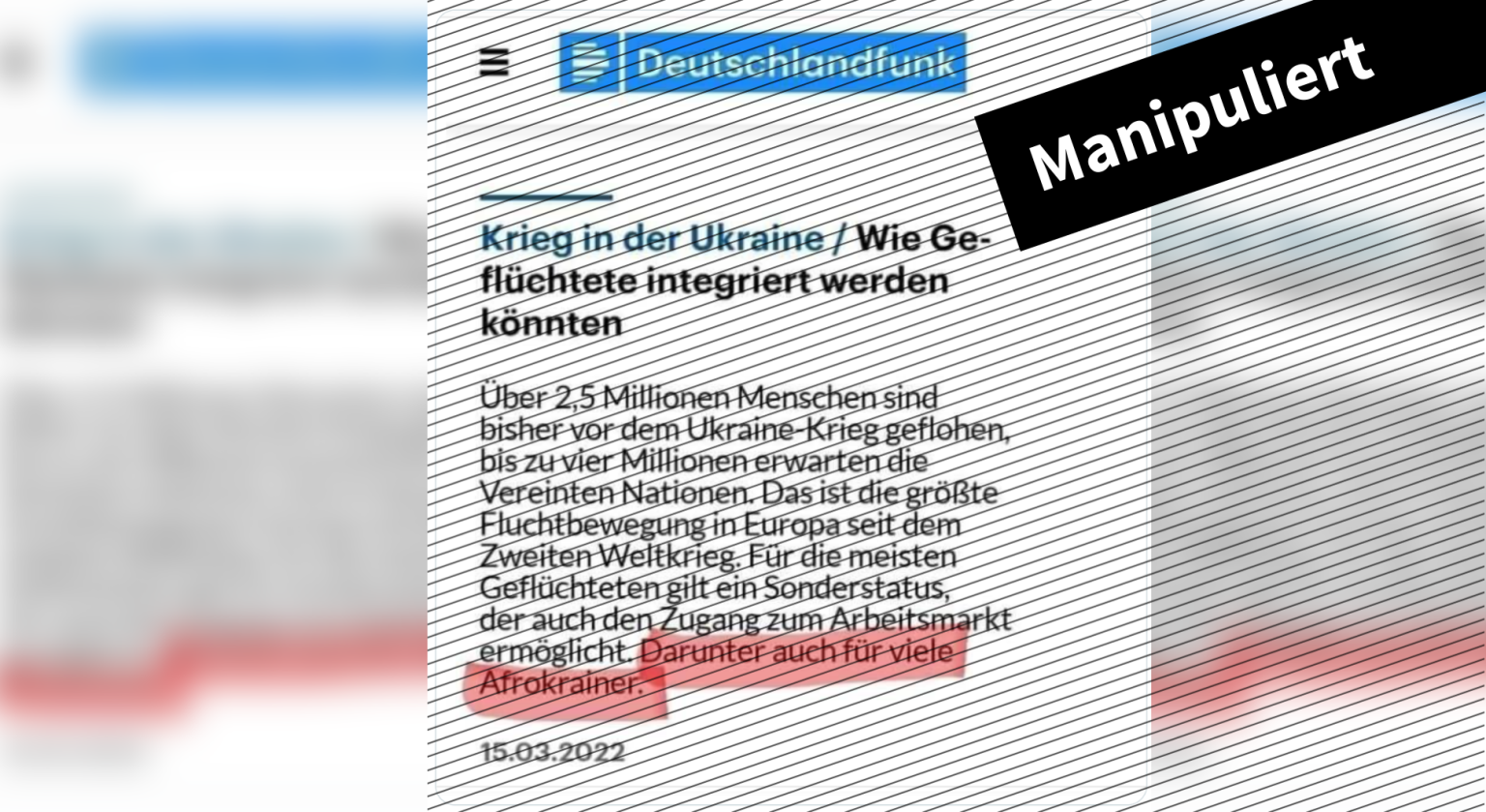 Auf Facebook und Twitter (hier und hier) verbreitet sich die Behauptung, der Deutschlandfunk habe in einem Artikel über Geflüchtete aus der Ukraine den Ausdruck „Afrokrainer“ benutzt. Der Ausdruck solle verschleiern, dass unter den Geflüchteten aus der Ukraine viele Menschen seien, die illegal nach Deutschland migrierten. Dafür, dass der Sender den Ausdruck tatsächlich in seinem Artikel … Nein, der Deutschlandfunk schrieb in einem Artikel nicht von „Afrokrainern“ weiterlesen