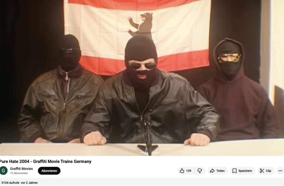 Über eine Bilder-Rückwärtssuche findet sich unter anderem ein Musikvideo mit Bezug zur Berliner Graffitiszene, in dem an mehreren Stellen Bilder der drei Maskierten auftauchen. Dieses Video mit dem Titel „Pure Hate und OGS“ wurde schon im September 2010 bei Youtube hochgeladen. Dass das Videostatement irgendetwas mit dem Brandanschlag 2026 zu tun hat, ist also ausgeschlossen. Sucht man weiter nach dem Titel „Pure Hate“ findet man einen 75 Minuten langen Film über die Graffitiszene in Berlin aus dem Jahr 2004. Darin findet sich exakt derselbe Ausschnitt, der jetzt als Videostatement verbreitet wird.