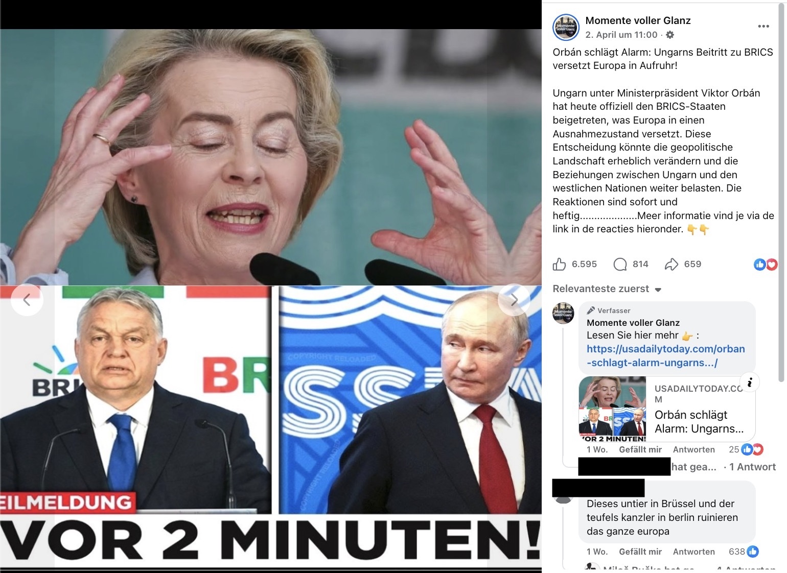 Kurz vor der Parlamentswahl in Ungarn am 12. April 2026 kursieren international mehrere Falschbehauptungen, die den Russland-nahen Regierungschef Viktor Orbán als besonders EU-kritisch darstellen. Etwa heißt es in mehreren Beiträgen auf Facebook und Youtube, dass Ungarn angeblich dem losen Staatenverbund Brics beigetreten sei. Die Abkürzung „Brics“ setzt sich aus den Namen der ersten Staaten im Bund zusammen – Brasilien, Russland, Indien, China und Südafrika.
