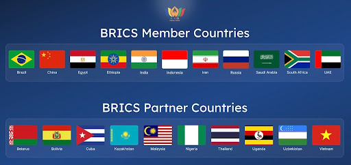 Brics ist ein Verbund von inzwischen elf Mitglieds- und zehn Partnerstaaten; dazu gehören Brasilien, Russland, Indien, China und Südafrika – später dazu kamen unter anderem Uganda, Belarus, Kuba und Nigeria. Die Konrad-Adenauer-Stiftung schreibt, tendenziell werde die erweiterte Brics-Staatengruppe weltweit als anti-westliches Bündnis gesehen.