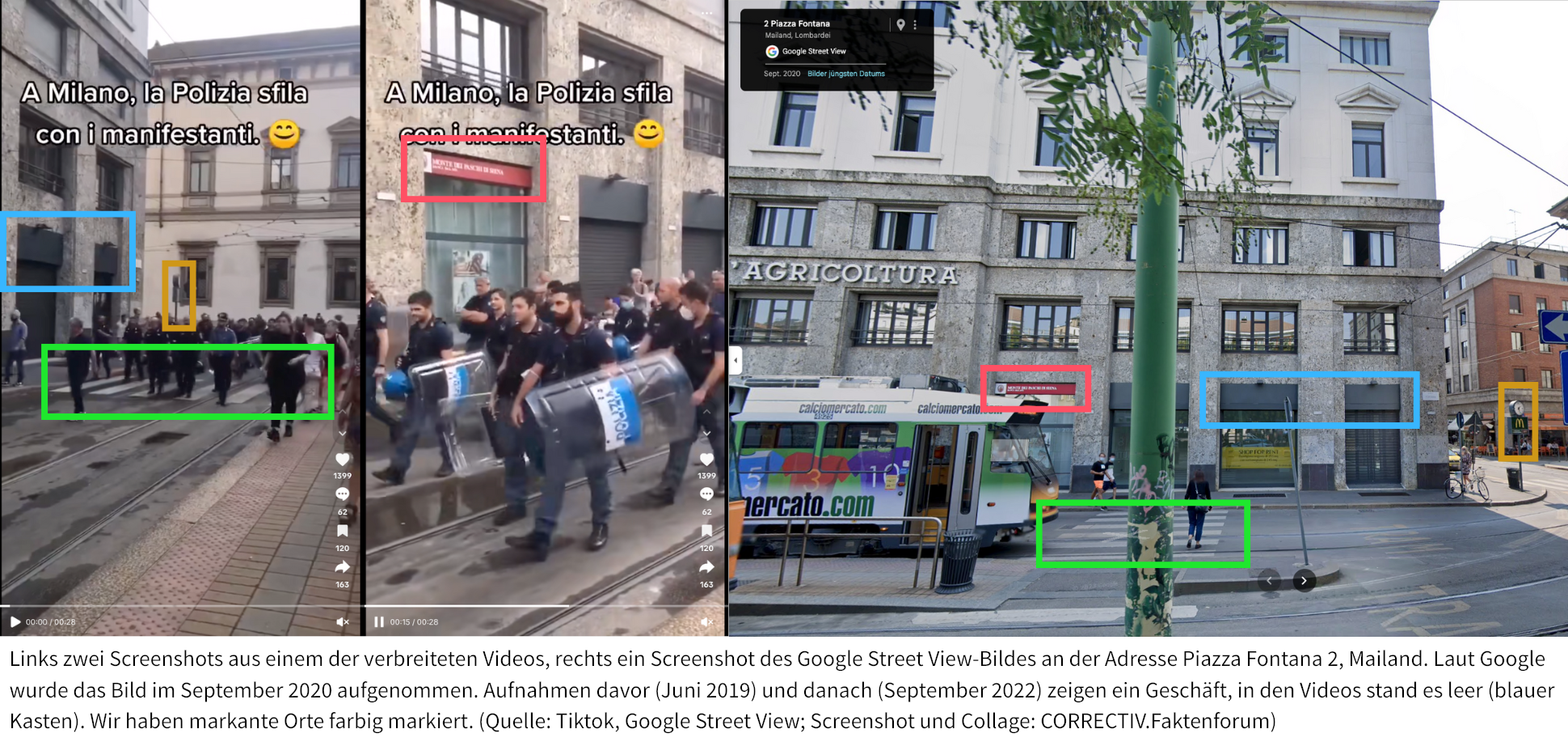Wo entstand das Video? Ein Schaufenster-Schriftzug zeigt, dass die Szene vor einer Filiale der „Banca Monte dei Paschi di Siena“ aufgenommen wurde. Der Abgleich mit Google Maps belegt den Aufnahmeort: Piazza Fontana 4, Mailand. Neben der Bankfiliale ist ein leeres Geschäft zu sehen. Beim Vergleich von Aufnahmen aus verschiedenen Jahren bei Google Street View sehen wir, dass dort seit mindestens Mai 2022 ein Design-Geschäft mit dem Namen „Antolini“ eingezogen ist. Die Unternehmenswebseite listet diesen Standort ebenfalls auf. Wir finden auch einen Bericht vom 7. Oktober 2021 über die neue Filiale in Mailand. Damit sind die Videos vermutlich vor Oktober 2021 entstanden.