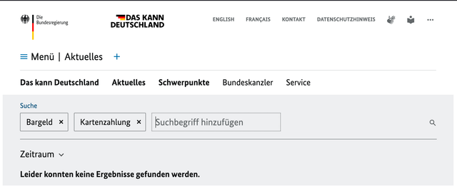 Zusätzlich haben wir die offizielle Webseite der Bundesregierung durchsucht, auf der alle Reden des Bundeskanzlers dokumentiert sind. Eine Suche nach „Bargeld“ und „Kartenzahlung“ liefert keine Hinweise auf ein geplantes Bargeldverbot. Auch hier zeigt sich: Es gibt keinerlei Belege dafür, dass Merz eine solche Maßnahme angekündigt hat.