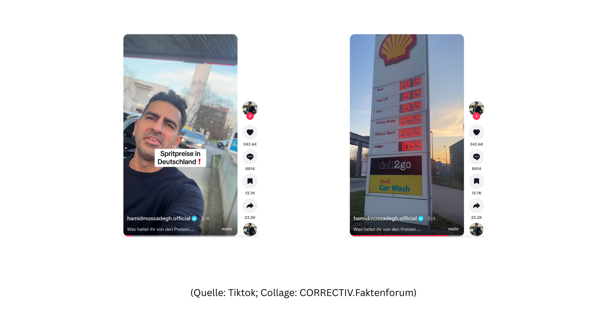 Neben dem TikTok-Video kursieren auf Instagram und Facebook Beiträge, die Spritpreise zwischen Ländern anhand einzelner Tankstellenpreise oder Momentaufnahmen vergleichen. Solche Beispiele sind nicht geeignet, um die tatsächliche Preisentwicklung zu zeigen, da sie nur einen spezifischen Zeitpunkt abbilden und weder regionale Unterschiede noch zeitliche Schwankungen einbeziehen. Zudem fehlt in Beiträgen, die zwei Fotos gegenüberstellen, oft die Angabe, wo und wann die Aufnahmen entstanden sind. Ohne diese Informationen lassen sich die gezeigten Preise nicht sinnvoll einordnen.