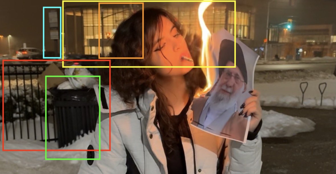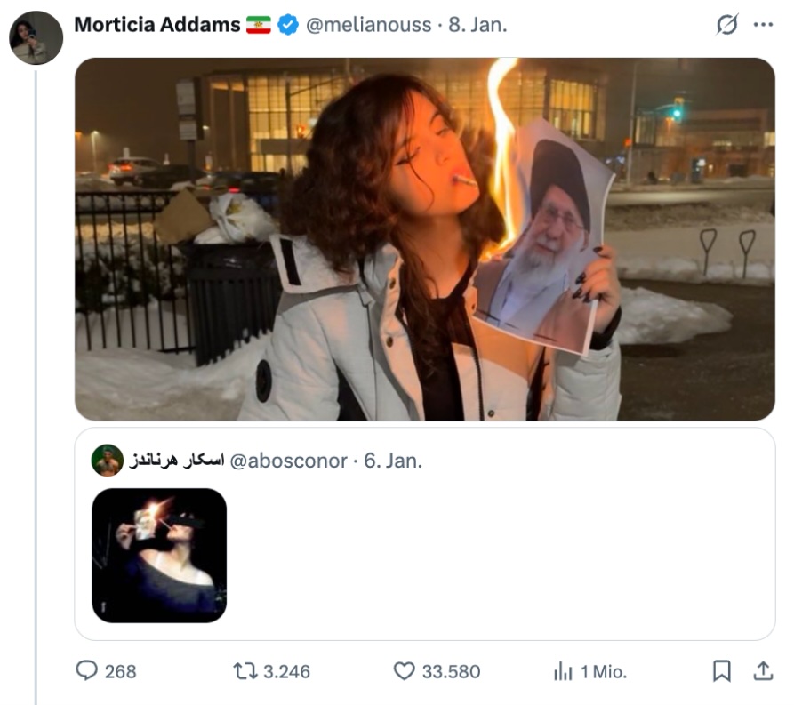 Eine junge Frau steht mit Winterjacke auf einem Gehweg, im Hintergrund sind vorbeifahrende Autos und Schnee zu sehen. In der linken Hand hält sie ein brennendes Foto von Ajatollah Ali Chamenei, dem religiösen und politischen Anführer des Iran, und zündet sich damit eine Zigarette an. Dieses Bild mit Symbolcharakter für die aktuellen Proteste im Iran verbreitete sich ab dem 8. Januar viral in Sozialen Netzwerken und wurde von mehreren Medien aufgegriffen. International ahmten Regierungskritikerinnen und -kritiker die Geste nach oder griffen sie in Illustrationen auf.