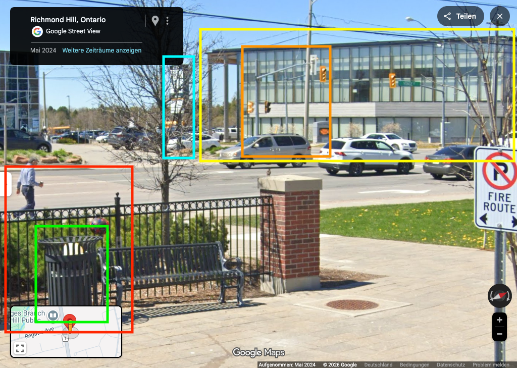 Der Journalist Luís Galrão fand den genauen Aufnahmeort. Dass die Aufnahme dort, in Kanada, gemacht wurde, zeigt ein Vergleich mit Google Maps. Im Hintergrund ist die Oak Ridges Bibliothek in Ontario, Kanada zu erkennen (im Bild gelb markiert). Auch der Zaun (rot), der Mülleimer (grün) sowie die Ampeln (orange) und Schilder (blau) stimmen überein: