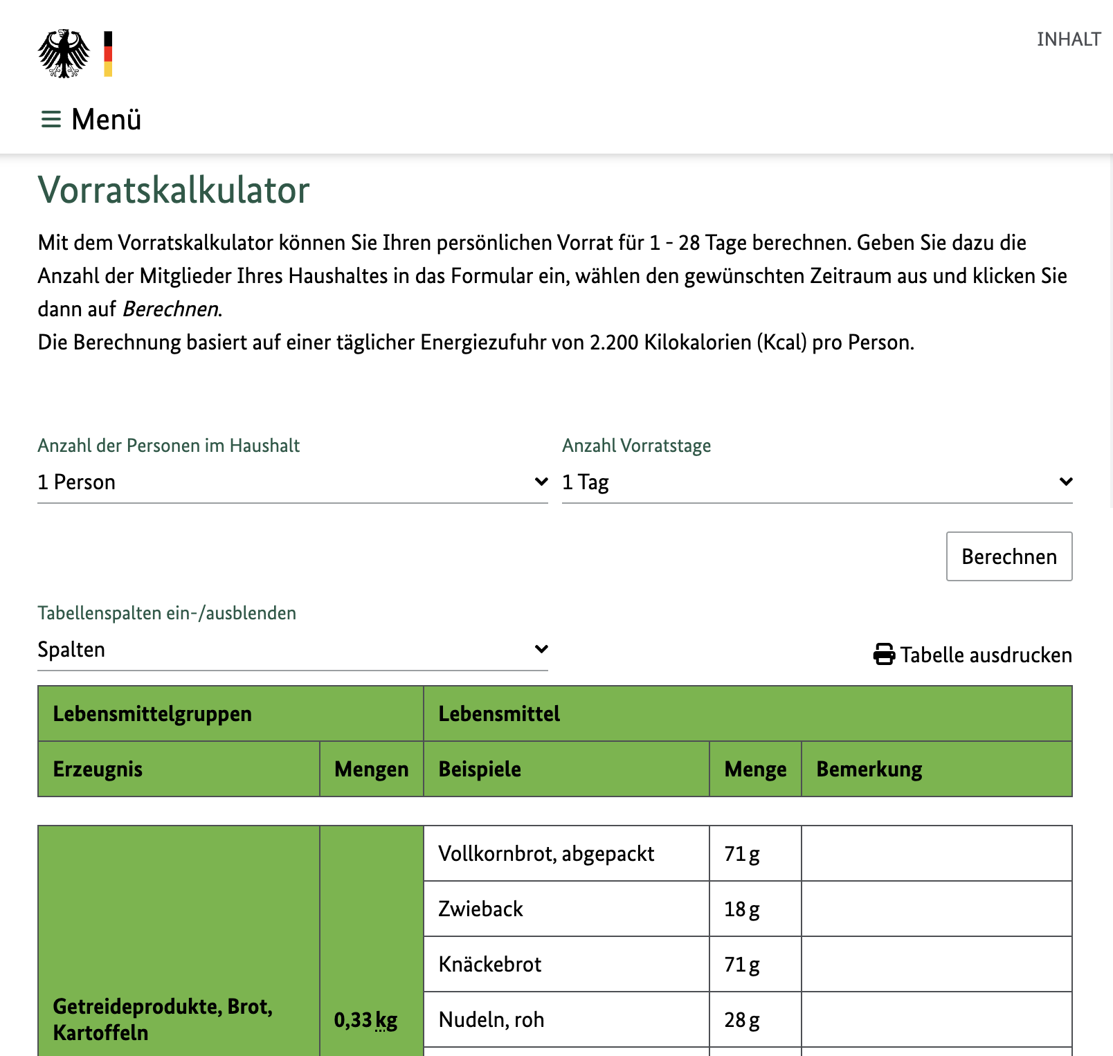 Als Richtwert benötige jeder Haushalt etwa zwei Liter Wasser pro Person und Tag, haltbare Lebensmittel, persönliche Medikamente und Hygieneartikel (mehr dazu weiter unten). Das BBK empfiehlt hierzu einen Online-Rechner, mit dem der Vorrat geplant werden kann.