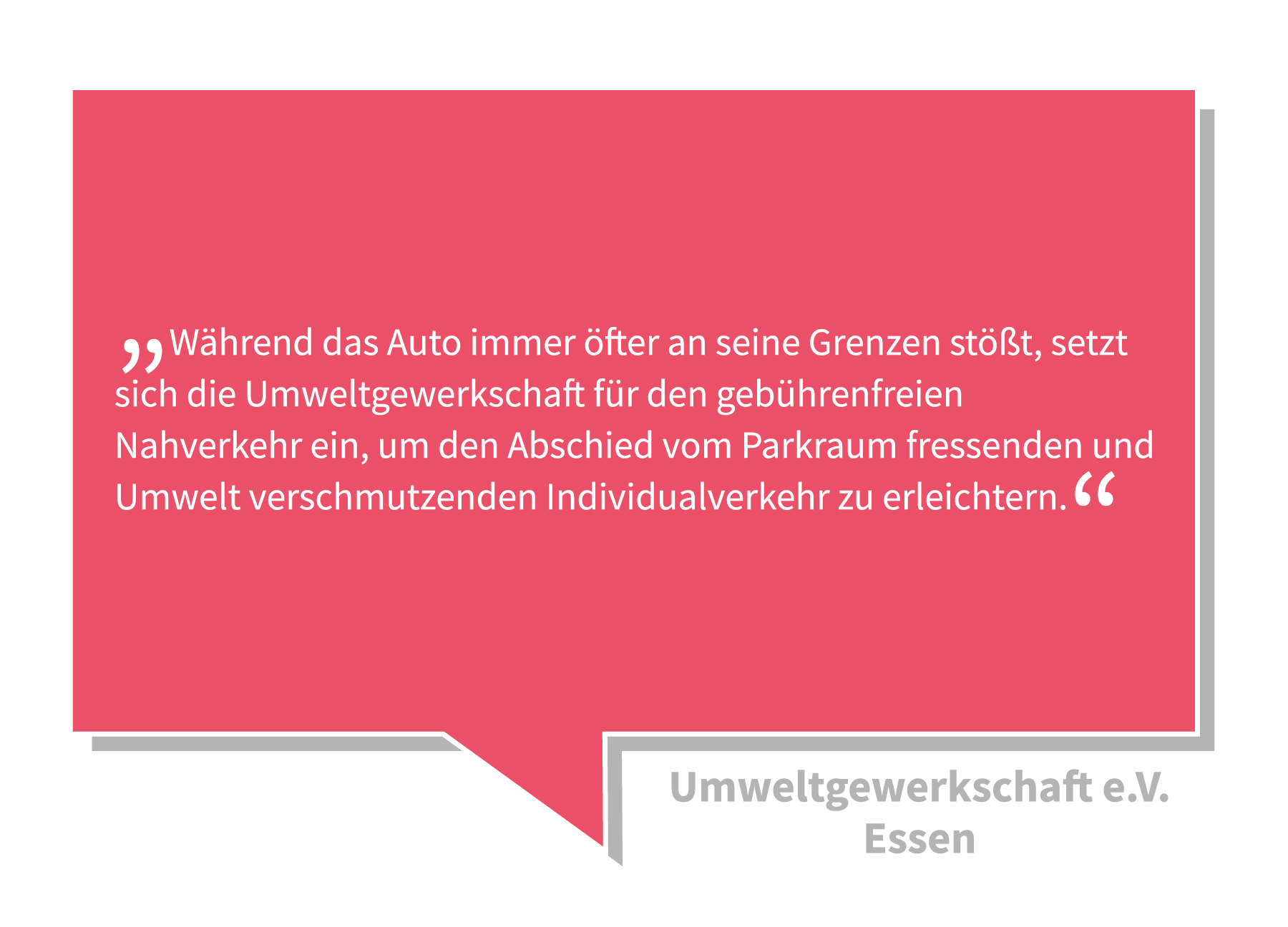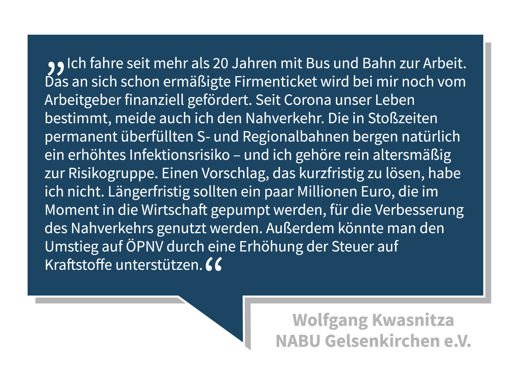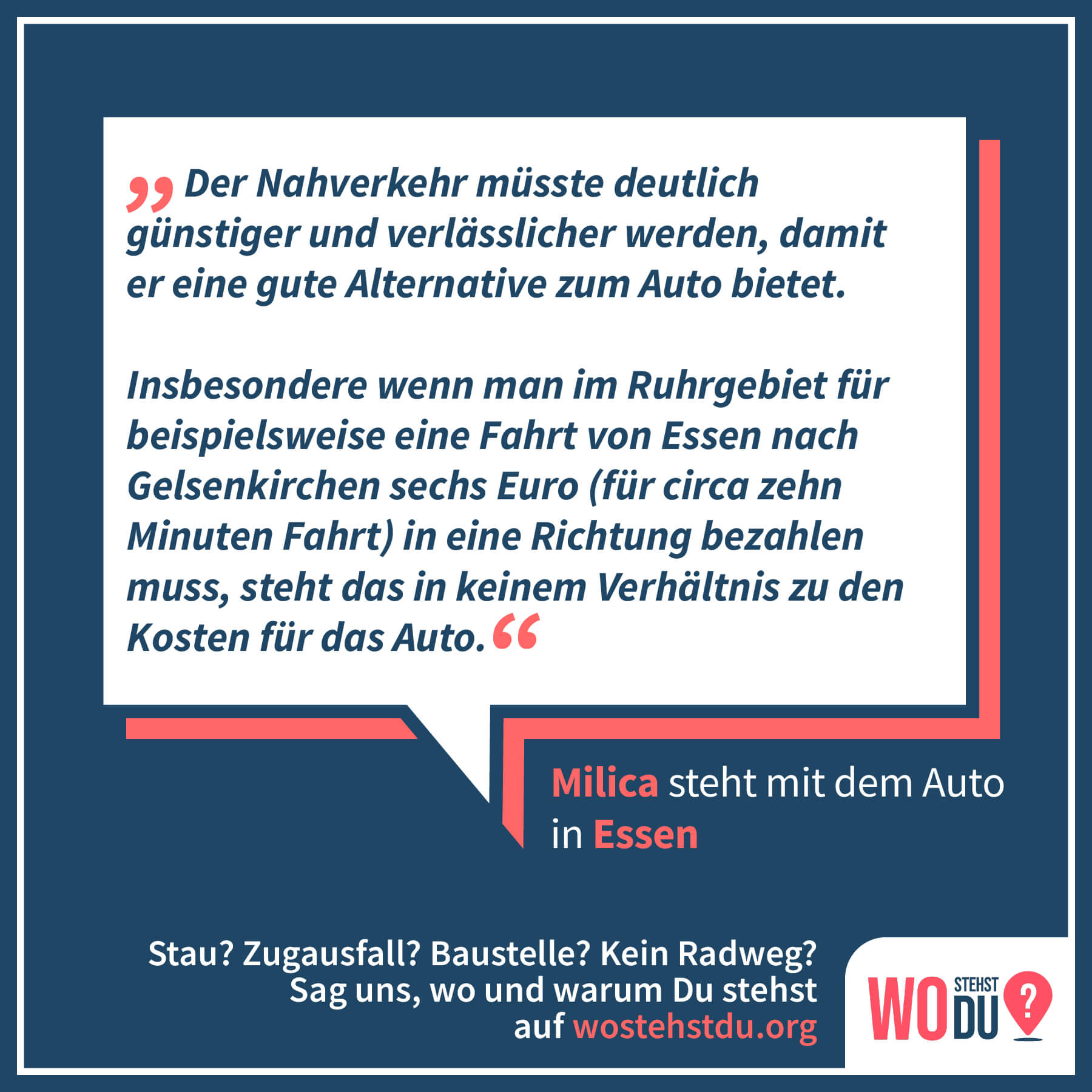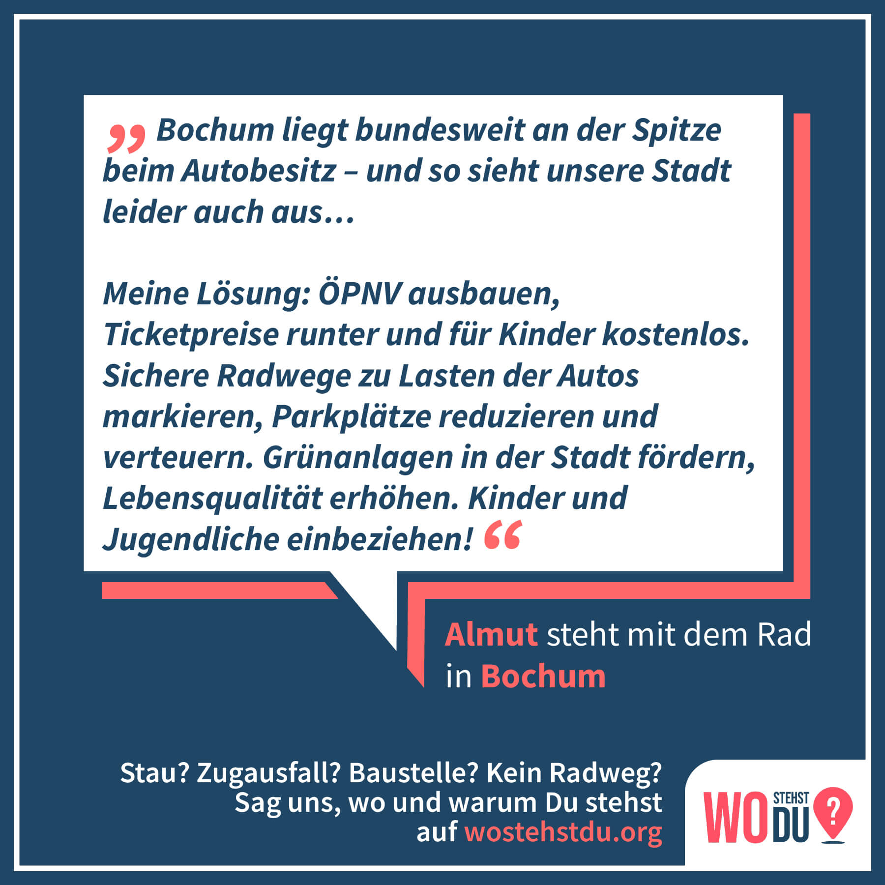 Statt anderthalb Stunden mit dem Auto sei sie jeden Werktag fast vier Stunden unterwegs gewesen, schreibt Simone, nur um zur Arbeit in 28 Kilometer Entfernung zu kommen und wieder zurück. Almut aus Bochum hat eine genau Vorstellung, was die Region braucht, um mobiler zu werden. Auch sie hat uns über die Seite Wo stehst Du? geschrieben: „Bochum liegt bundesweit an der Spitze beim Autobesitz – und so sieht unsere Stadt leider auch aus… Meine Lösung: ÖPNV ausbauen, Ticketpreise runter und für Kinder ganz frei, sichere Radwege zu Lasten der Autos markieren, Parkplätze reduzieren und verteuern, Grünanlagen und Bäume in der Stadt fördern und somit die Lebensqualität erhöhen!“