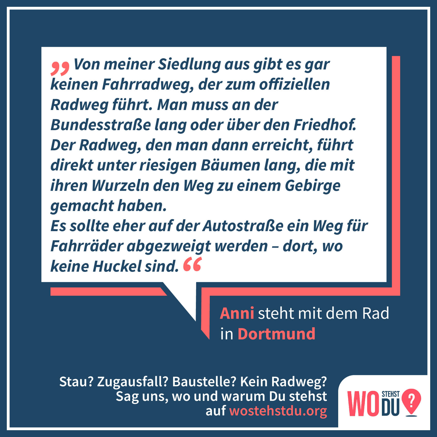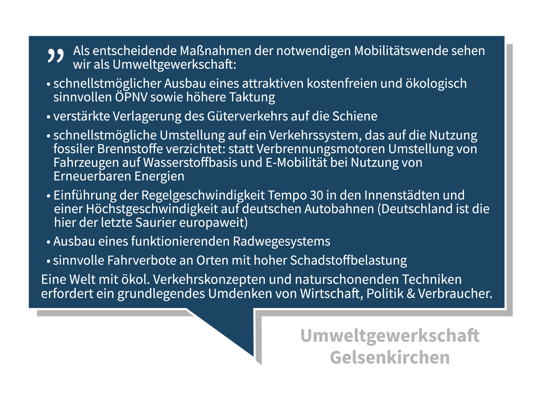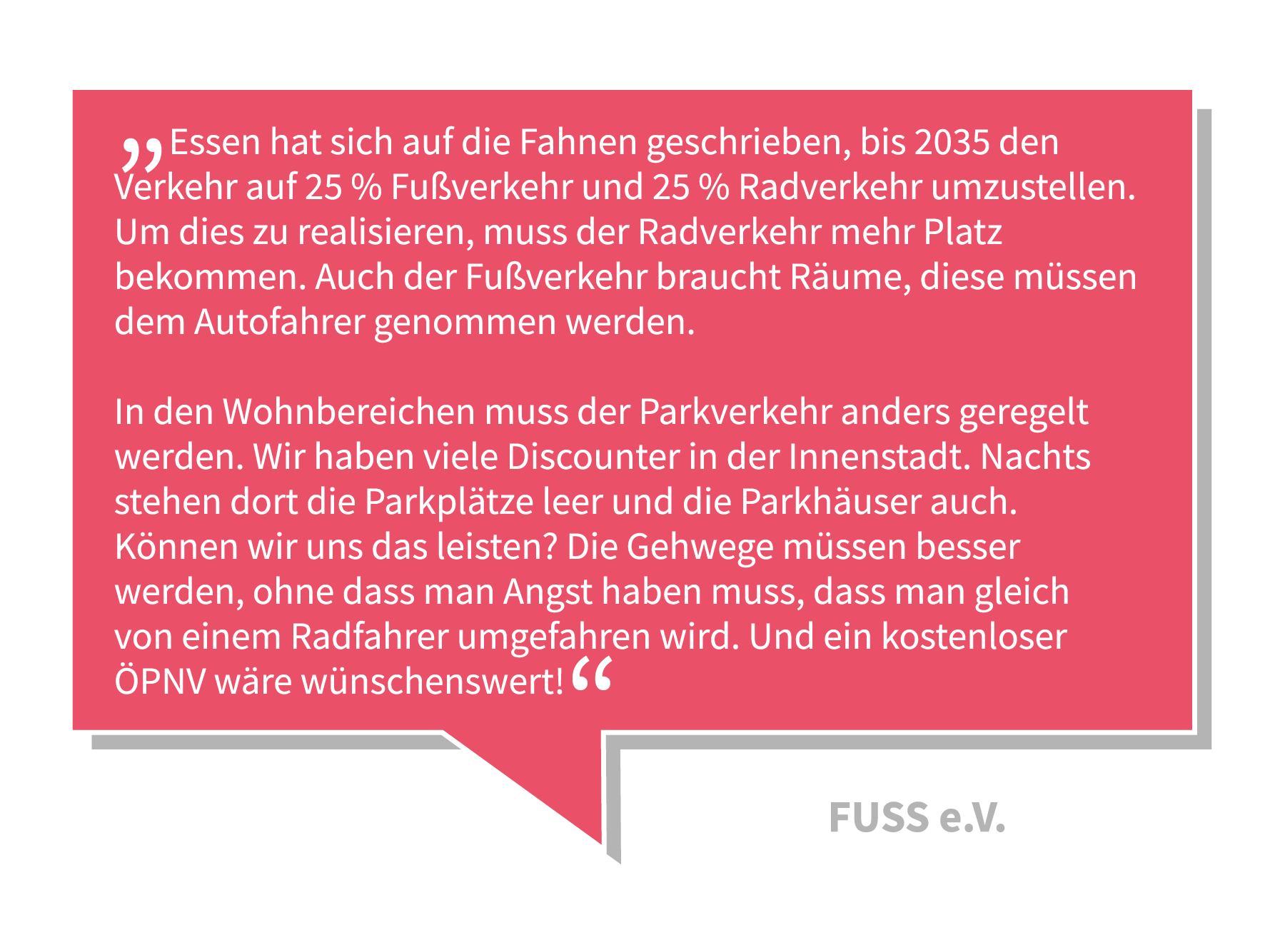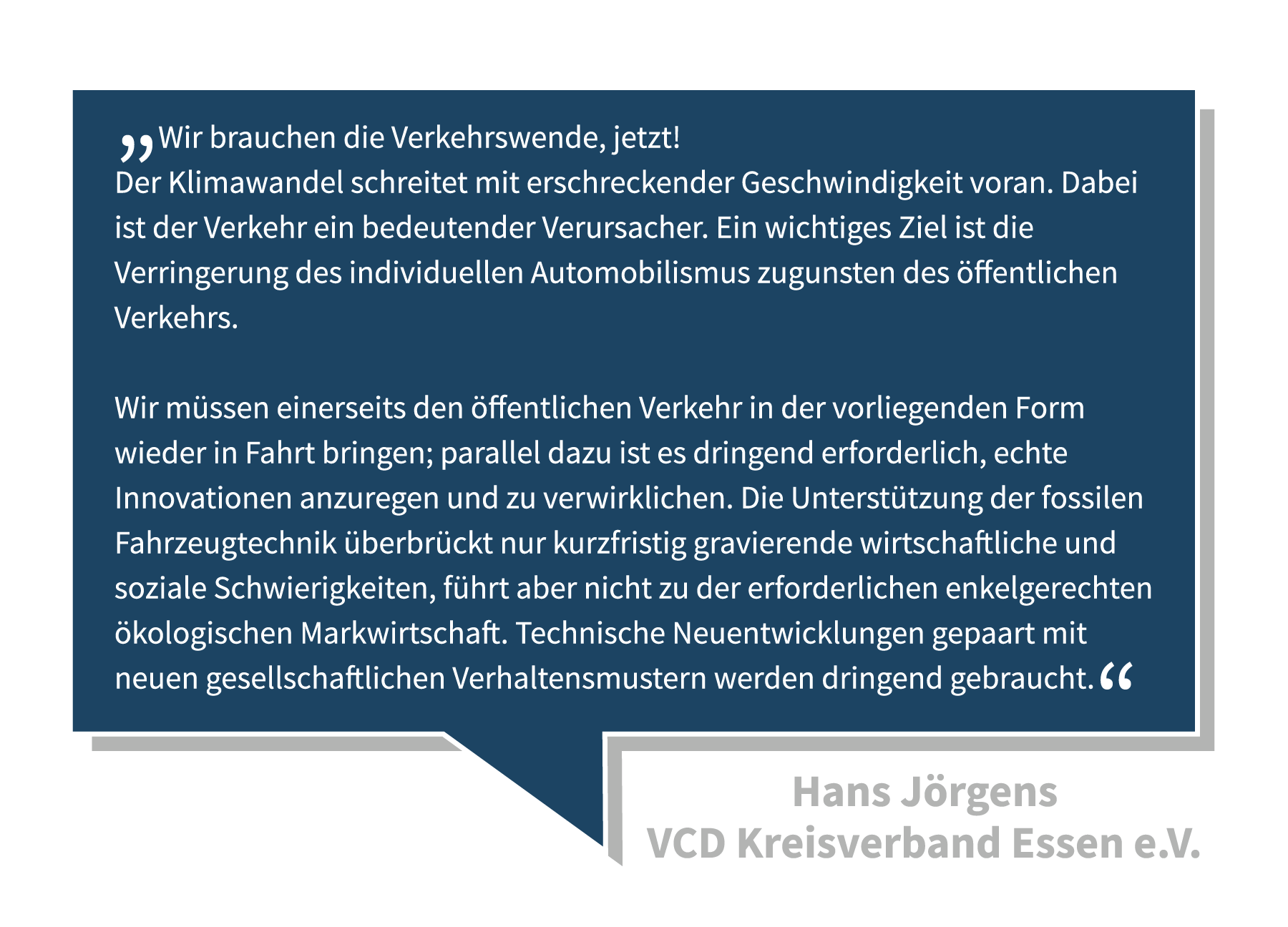 Statt anderthalb Stunden mit dem Auto sei sie jeden Werktag fast vier Stunden unterwegs gewesen, schreibt Simone, nur um zur Arbeit in 28 Kilometer Entfernung zu kommen und wieder zurück. Almut aus Bochum hat eine genau Vorstellung, was die Region braucht, um mobiler zu werden. Auch sie hat uns über die Seite Wo stehst Du? geschrieben: „Bochum liegt bundesweit an der Spitze beim Autobesitz – und so sieht unsere Stadt leider auch aus… Meine Lösung: ÖPNV ausbauen, Ticketpreise runter und für Kinder ganz frei, sichere Radwege zu Lasten der Autos markieren, Parkplätze reduzieren und verteuern, Grünanlagen und Bäume in der Stadt fördern und somit die Lebensqualität erhöhen!“