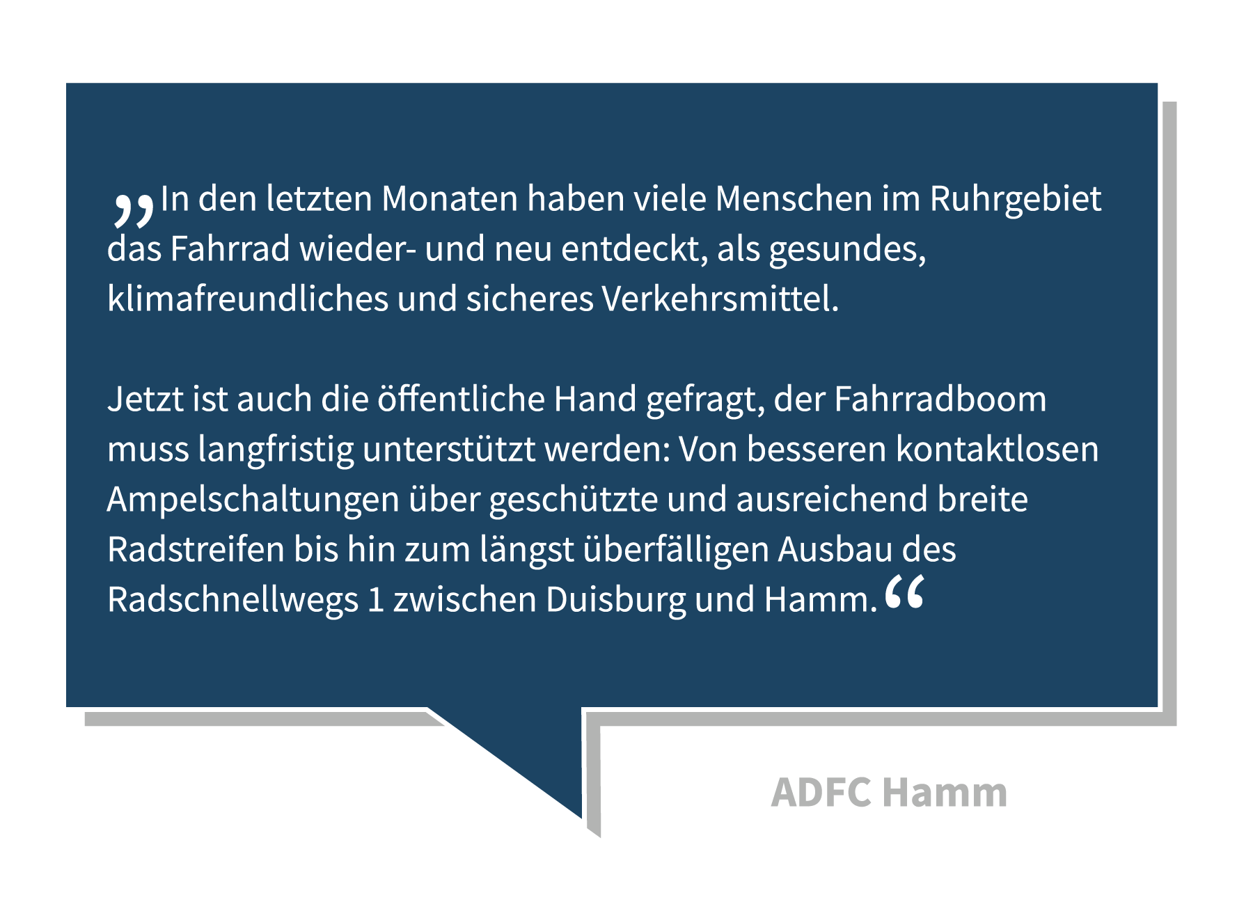 Der Lockdown hatte nicht nur Schattenseiten. Er hat uns auch Möglichkeiten gezeigt. Besonders, was unsere Mobilität, unsere täglichen Wege und Wartezeiten betrifft. Wir haben Initiativen und Bürger:innen nach ihren Hoffnungen nach dem Lockdown gefragt und uns genauer angeschaut, was in den vergangenen Monaten auf den Straßen des Ruhrgebiets los war. Ein Essay zur Verkehrswende im Revier.