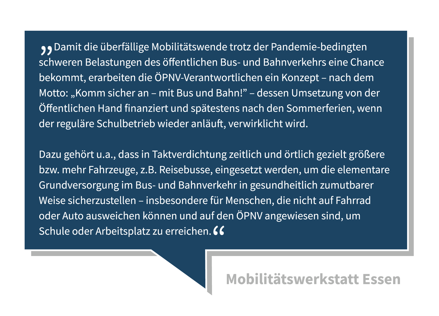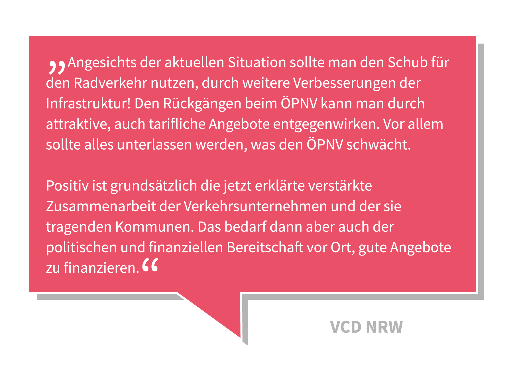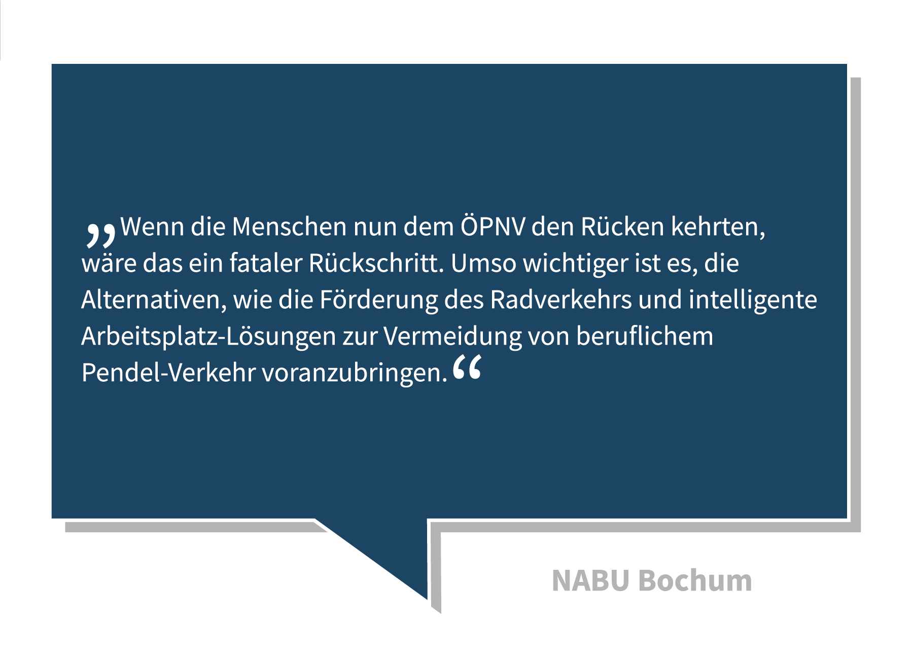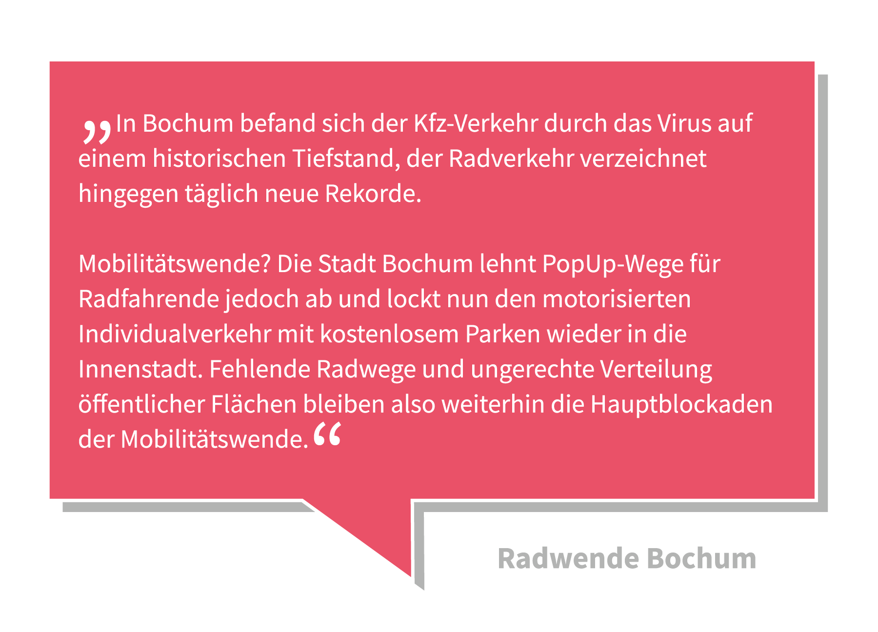 Um hier aus alten Bewegungsmustern ausbrechen und neue Wege gehen zu können, hat die Krise mögliche Chancen eröffnet: Jede:r dritte Deutsche sagte in einer repräsentativen McKinsey-Umfrage, nach der Krise mehr Rad fahren zu wollen. Fast genauso viele wollten mehr zu Fuß gehen. Gleichzeitig gewann aber auch das Auto an Zuspruch, weil sich die Menschen im eigenen Wagen sicherer vor einer Infektion fühlten als in Bus und Bahn. Deswegen auch die Frei-Park-Aktion in Bochum, wie ein Sprecher der Stadt erklärt: „In der ersten Phase der Lockerungen wird die Reduzierung von Parkgebühren für PKW angeboten, da der Individualverkehr im Vergleich zum ÖPNV derzeit den erhöhten Hygieneanforderungen besser gerecht wird. Der Gesundheit der Bevölkerung wurde und wird Priorität eingeräumt.“