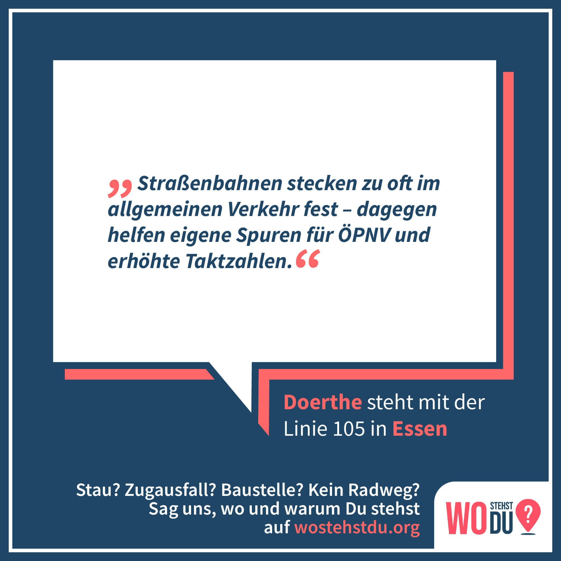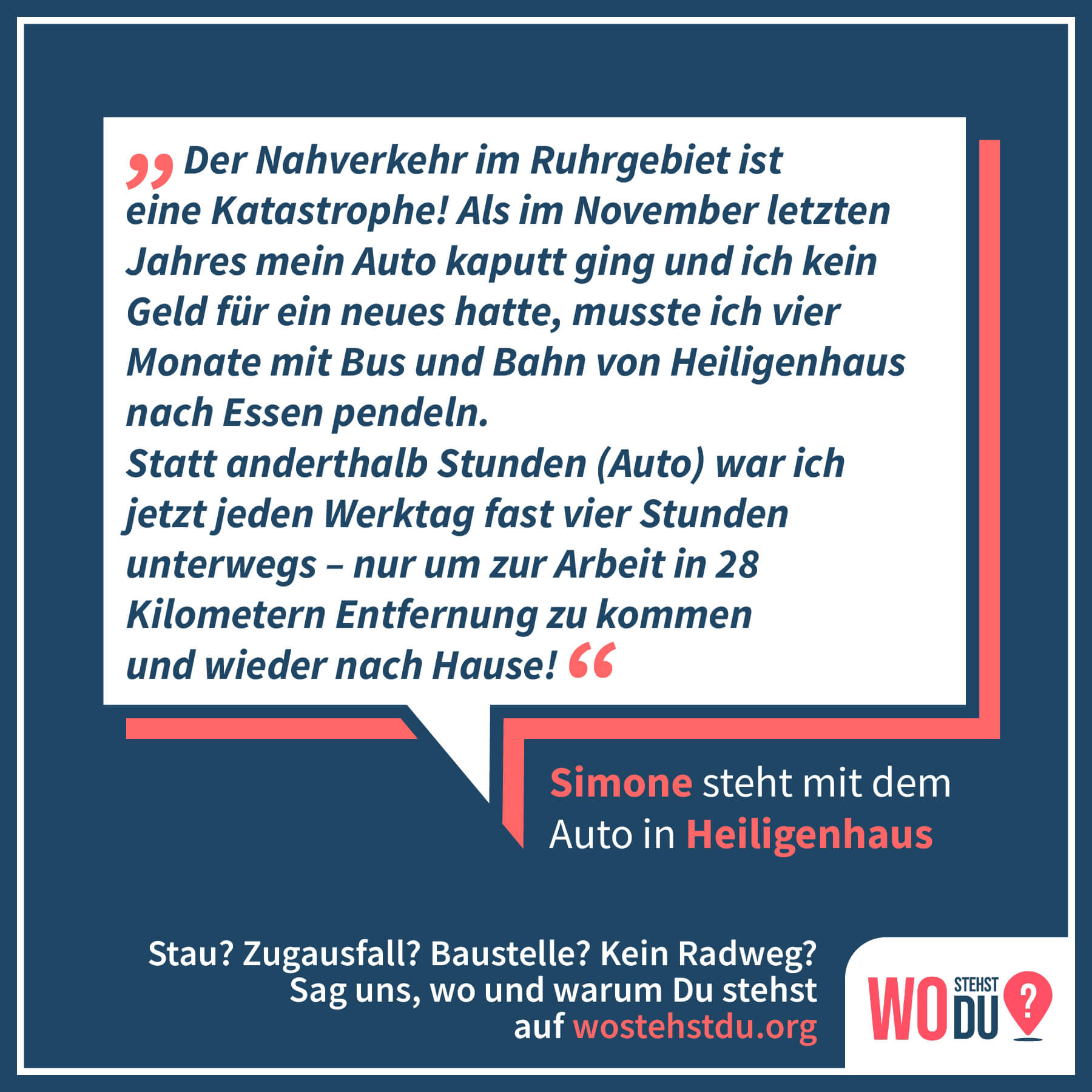 Wenn der Verkehr das Sorgenkind der Klimadebatte ist, ist der ÖPNV das Sorgenkind des Verkehrs. „Der Nahverkehr im Ruhrgebiet ist eine Katastrophe. Als im November letzten Jahres mein Auto kaputt ging und ich kein Geld für ein neues hatte, musste ich vier Monate mit Bus und Bahn von Heiligenhaus nach Essen pendeln“, schreibt uns Simone in unserer aktuellen Bürgerrecherche zur Verkehrswende im Ruhrgebiet. Auf der Seite www.wostehstdu.org sammeln wir in einem sogenannten Crowdnewsroom mit Menschen aus der Region Daten zu Stillständen. Wenn es im Stau, am Bahnsteig oder auf dem Fahrradweg nicht weitergeht, können sie uns auf der Seite direkt per Handy den Ort, den Grund, das Verkehrsmittel mitteilen und noch ein aussagekräftiges Foto oder ein Statement schicken. So wollen wir gemeinsam mit den Bürger:innen die Verkehrssituation im Ruhrgebiet analysieren und langfristig besser machen.
