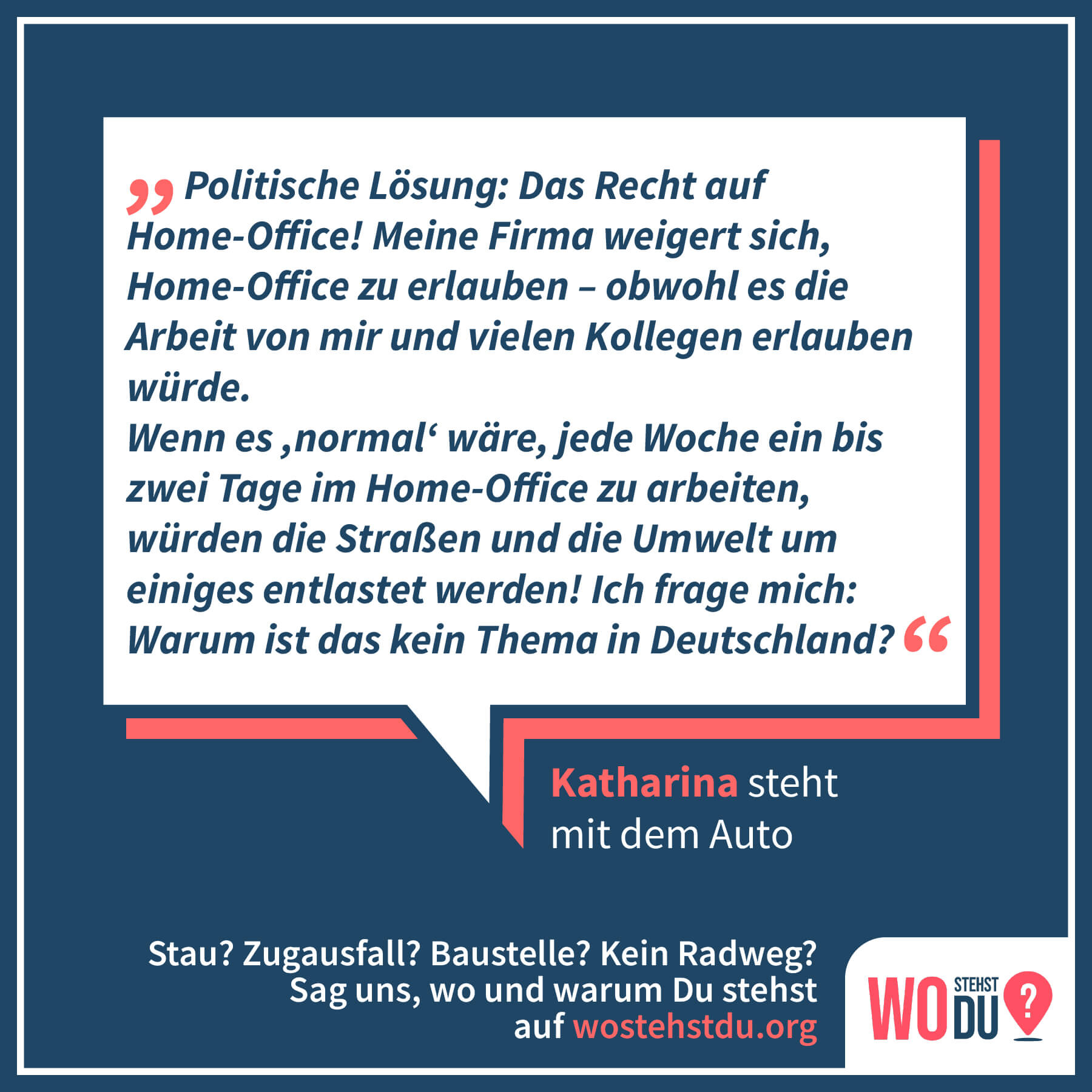 Auf eine weitere Möglichkeit, unsere Straßen von Stress und Stau zu befreien, hat uns Katharina bei unserer Bürgerrecherche hingewiesen. Sie schrieb uns im November vergangenen Jahres – lange vor Corona: „Die politische Lösung: das Recht auf Home-Office! Doch meine Firma weigert sich Home-Office zu erlauben, obwohl es die Arbeit von mir und vielen Kollegen erlauben würde.“