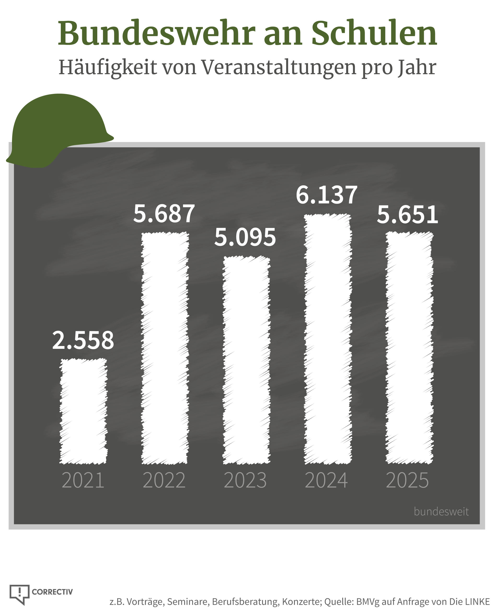 Der Spiegel titelte mit Blick auf die Daten: „Bundeswehr verdoppelt ihre Besuche an Schulen in kürzester Zeit.“ Allerdings ist diese Schlagzeile reichlich zugespitzt. Denn dieser Anstieg basiert auf den Zahlen des Jahres 2021 – ein Jahr, in dem der Schulbetrieb durch die Corona-Pandemie noch stark eingeschränkt war.