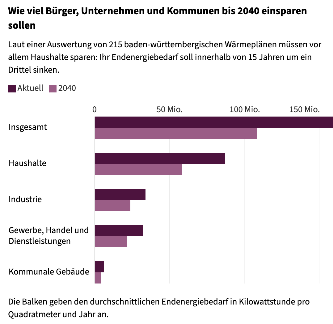 Nur wenn der Wärmeverbrauch von Unternehmen, öffentlichen Gebäuden und Wohnhäusern sinkt, kommen die Städte und Gemeinden auch ohne Öl und Erdgas aus. Die Auswertung der Wärmepläne zeigt: Den größten Anteil müssten die Bürgerinnen und Bürger in Baden-Württemberg zuhause einsparen. Denn bislang entweicht zu viel Wärme durch schlechte Wände, alte Dächer und einfache Fenster.