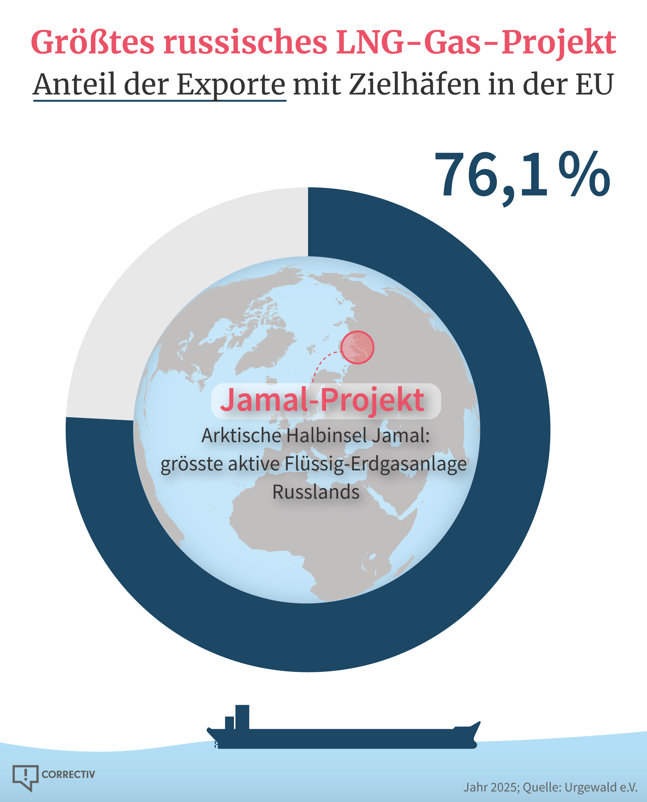 Bis 2027 will die EU kein russisches Erdgas mehr importieren. Doch von diesem Ziel ist sie noch weit entfernt, wie eine Analyse der Umweltschutzorganisation „Urgewald“ demonstriert. Demnach fließen über drei Viertel des wichtigsten russischen LNG-Gas-Projektes „Jamal“ nach Europa. Tendenz sogar leicht zunehmend im Vergleich zum letzten Jahr.