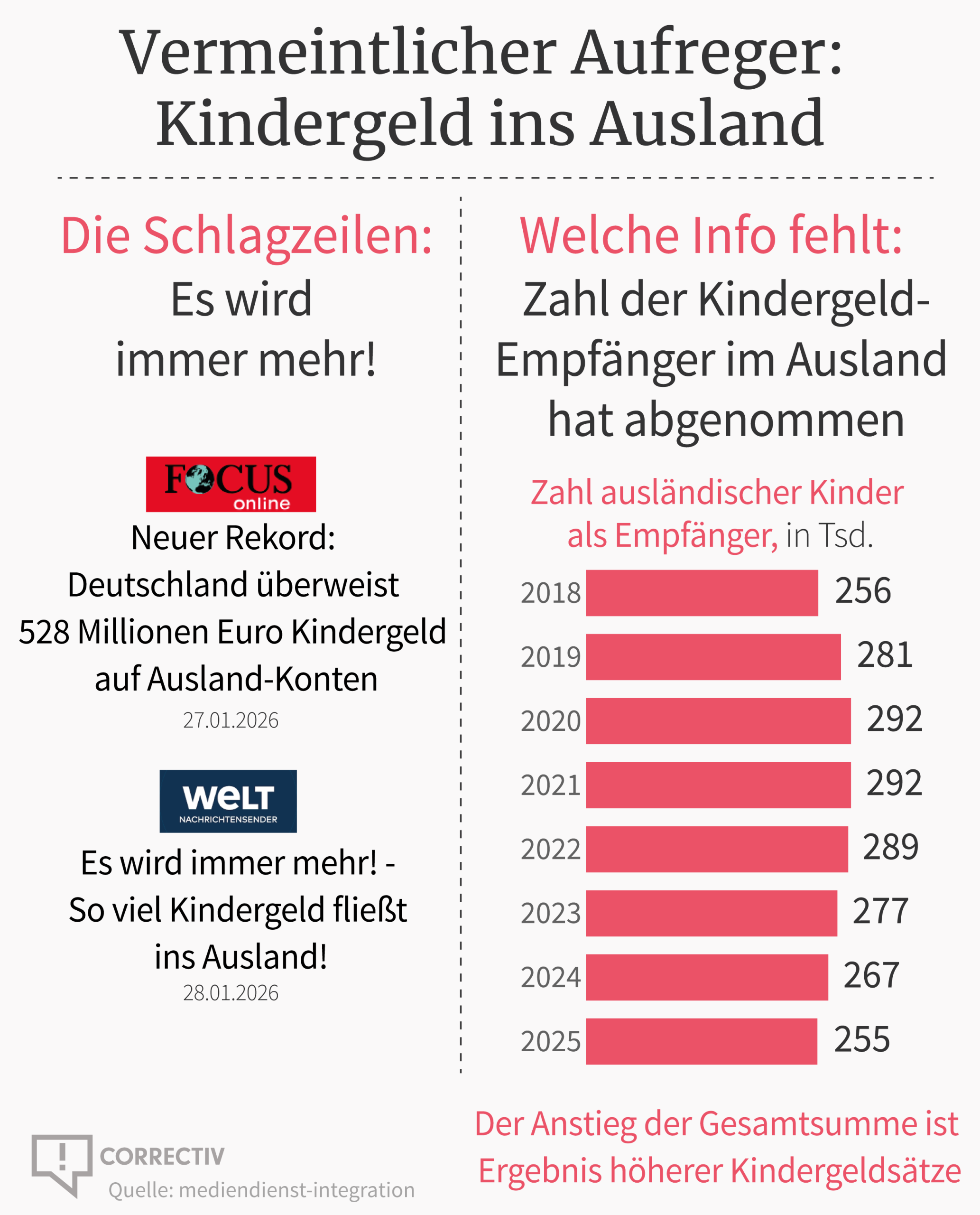 „Neuer Rekord“, „Es wird immer mehr“ – Kindergeld, das ins Ausland fließt, sorgte in den letzten Tagen in einigen Medien für Aufregung. Aber die Aufregung basiert auch auf unvollständigen Informationen, wie die Grafik des Tages zeigt. Der Mediendienst Integration ordnet die Daten ein: Rund ein Prozent der gesamten Kindergeld-Zahlungen gingen 2025 ins Ausland. Und zwar an Kinder von Menschen, die aufgrund ihrer Arbeitstätigkeit in Deutschland Ansprüche daran erworben haben. Hier geht es zum Hintergrund: