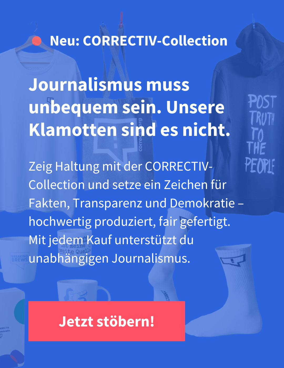 CORRECTIV ist das erste spendenfinanzierte Medium in Deutschland. Nur mit Ihrer Hilfe decken wir geheime Pläne auf, stoppen Propaganda-Kampagnen und bringen Fakten zurück in den Alltag. Machen Sie mit bei unserer großen Spendenaktion gegen Demokratiefeinde. Investieren Sie in die Wehrhaftigkeit unserer Demokratie!