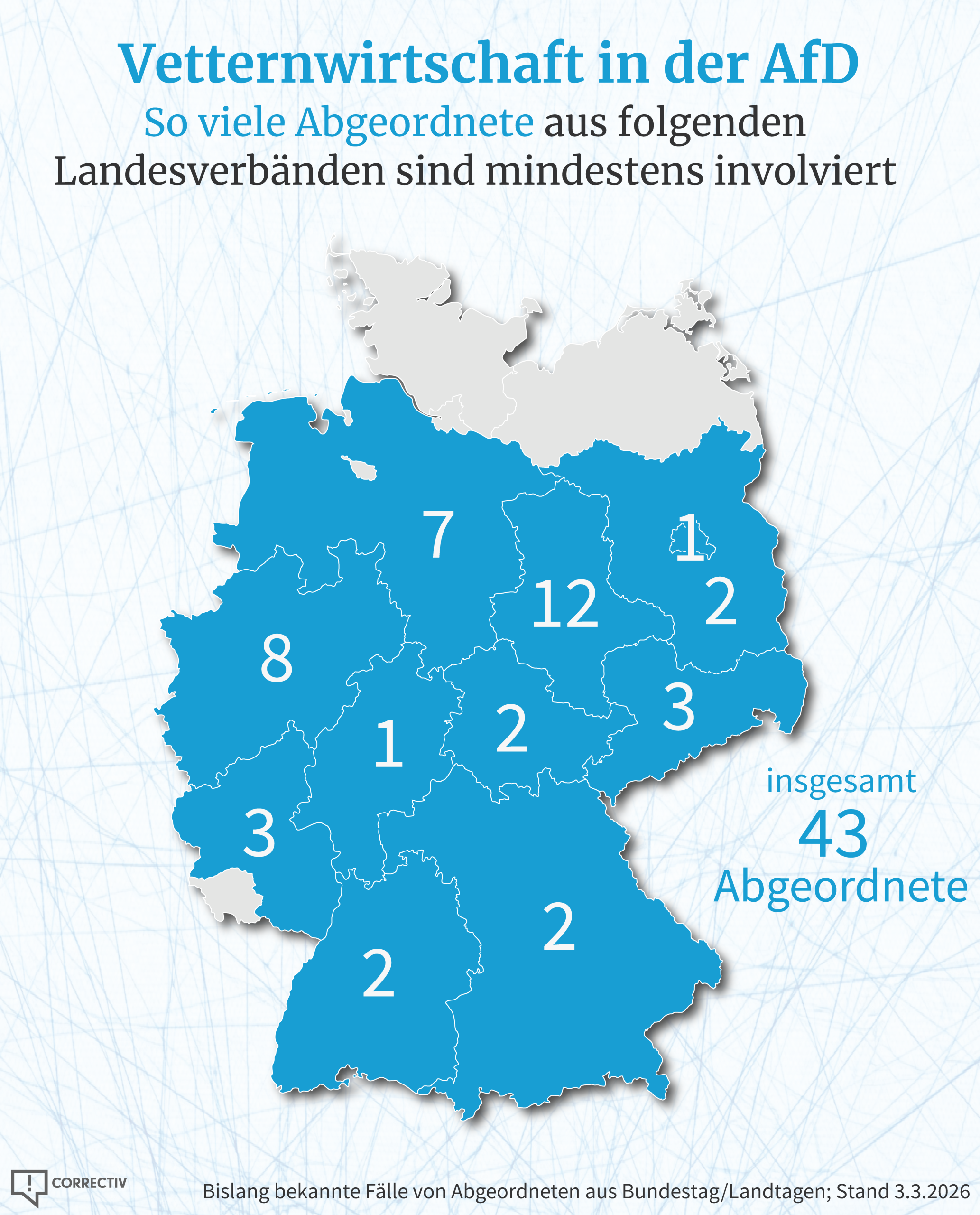 Woche für Woche kommen in der Vetternwirtschafts-Affäre der AfD neue Fälle ans Licht. Wie groß das bislang bekannte Ausmaß ist, zeigt die Grafik des Tages. Wenn Sie den Überblick behalten möchten – CORRECTIV hält Sie mit diesem Tracker auf dem Laufenden: