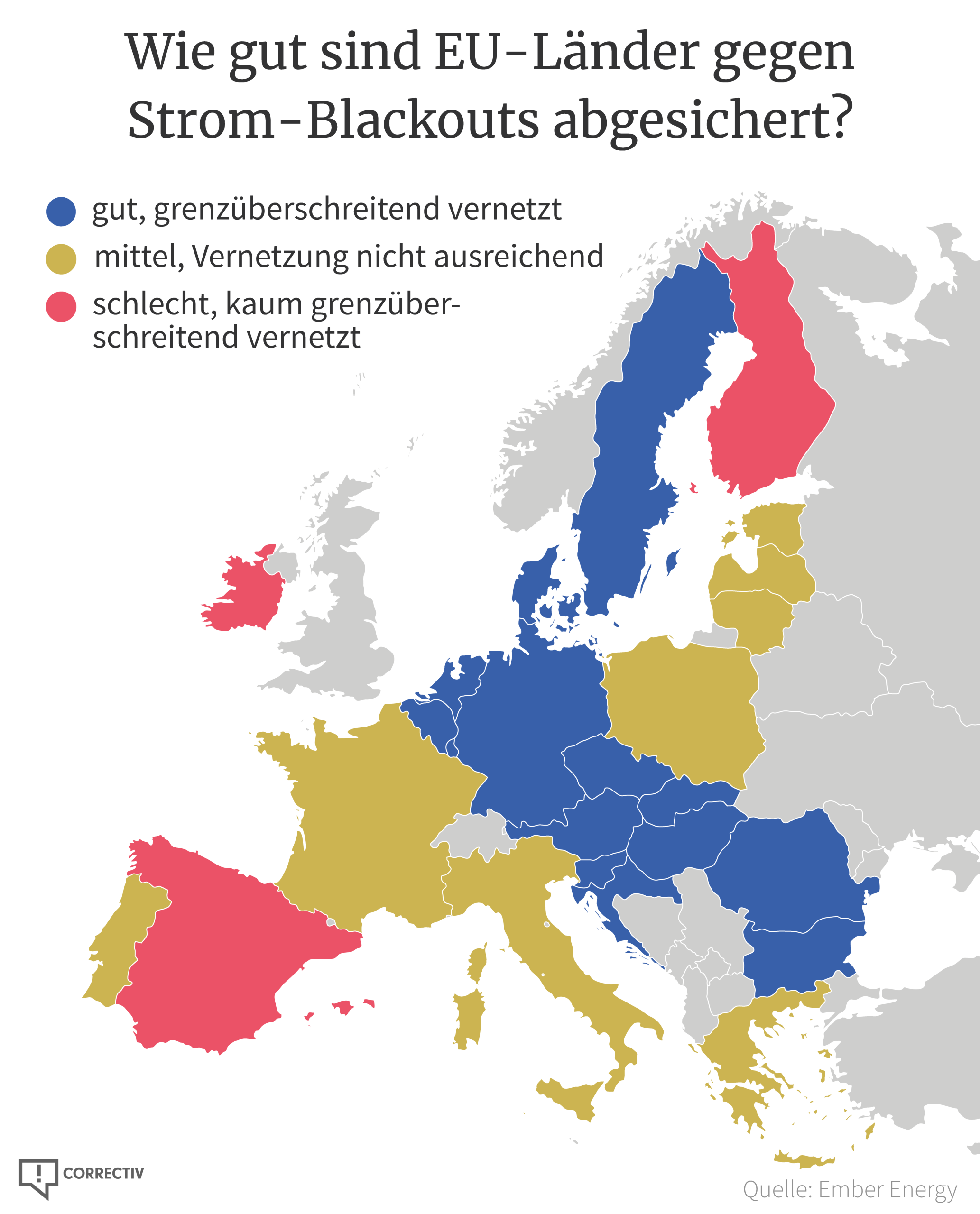 Etwa 55 Prozent des europäischen Stromnetzes sind schlecht auf mögliche Blackouts vorbereitet. Das schreibt die Denkfabrik Ember Energy in einer Analyse. Der wichtigste Grund: Sie sind nur unzureichend mit ihren Nachbarländern vernetzt, die im Schadensfall Strom liefern könnten. Im Falle einer Sabotage beispielsweise drohen so großflächige Stromausfälle. Deutschland hingegen ist laut Studie gut vorbereitet. Das hat mit der Lage inmitten von Europa und einer guten Anbindung an die Nachbarländer zu tun. Besonders vulnerabel sind hingegen Spanien, Finnland und Irland.