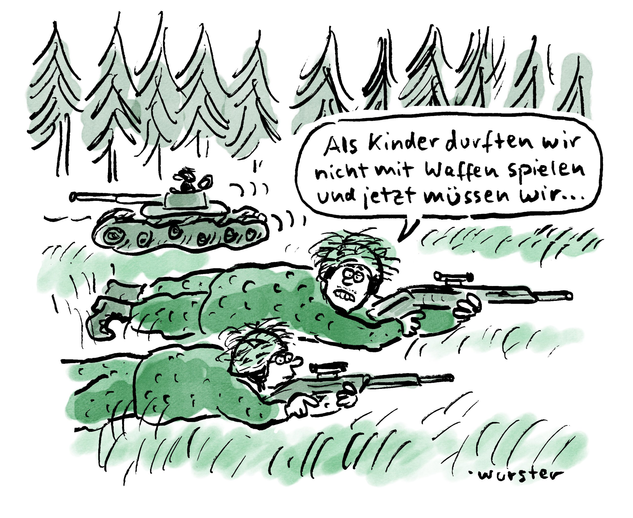 Neue Wehrpflicht – oder nicht? Auch heute gibt es darauf einen humoristischen Blick, diesmal von Miriam Wurster. Die Bremerin ist eine Cartoonistin und Illustratorin, die bei zahlreichen Medien publiziert hat, unter anderem bei Titanic und Charlie Hebdo.