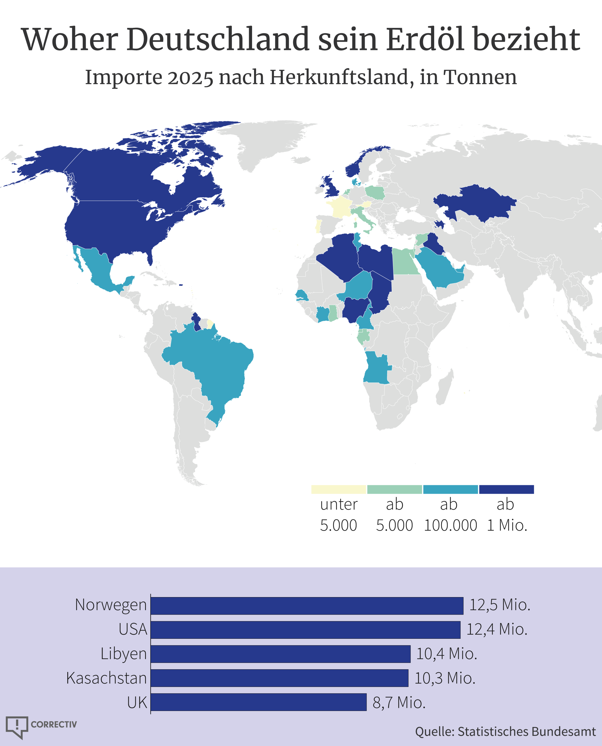 Die Straße von Hormus steht aktuell im Nachrichtenfokus. Denn die dort verursachte Knappheit lässt weltweit die Preise fossiler Rohstoffe steigen. Doch woher bezieht Deutschland sein Erdöl? Das zeigt die heutige Grafik des Tages.