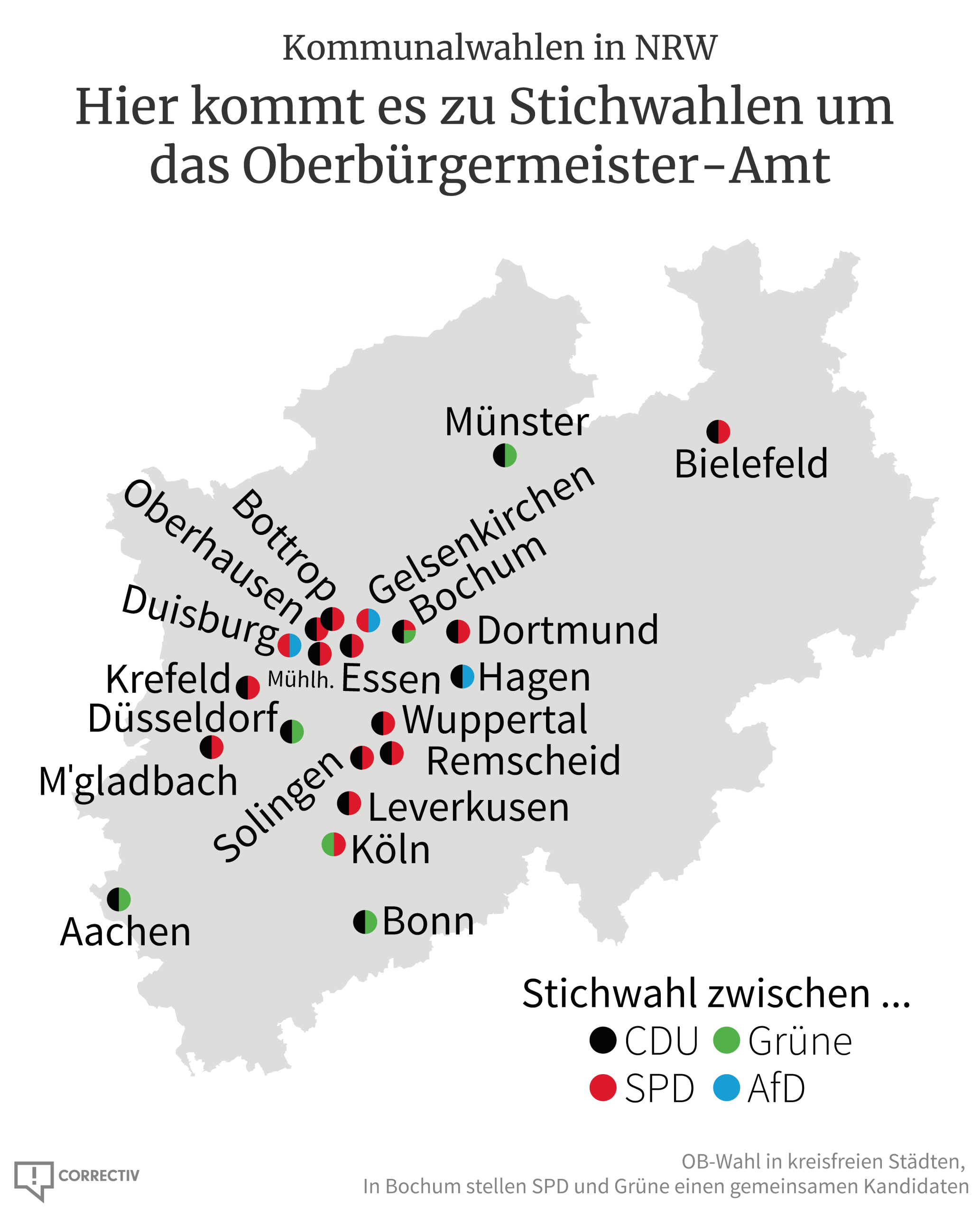 In drei Städten kommt es nun zu Stichwahlen mit AfD-Beteiligung, wie unsere Grafik des Tages zeigt. Darunter befindet sich auch Gelsenkirchen, wo CORRECTIV vor kurzem eine eigene Lokalredaktion eröffnet hat. Die bleibt für Sie dran – und berichtet vor Ort über die Hintergründe der Stichwahl. Sie haben dazu Fragen oder Hinweise? Schreiben Sie an: