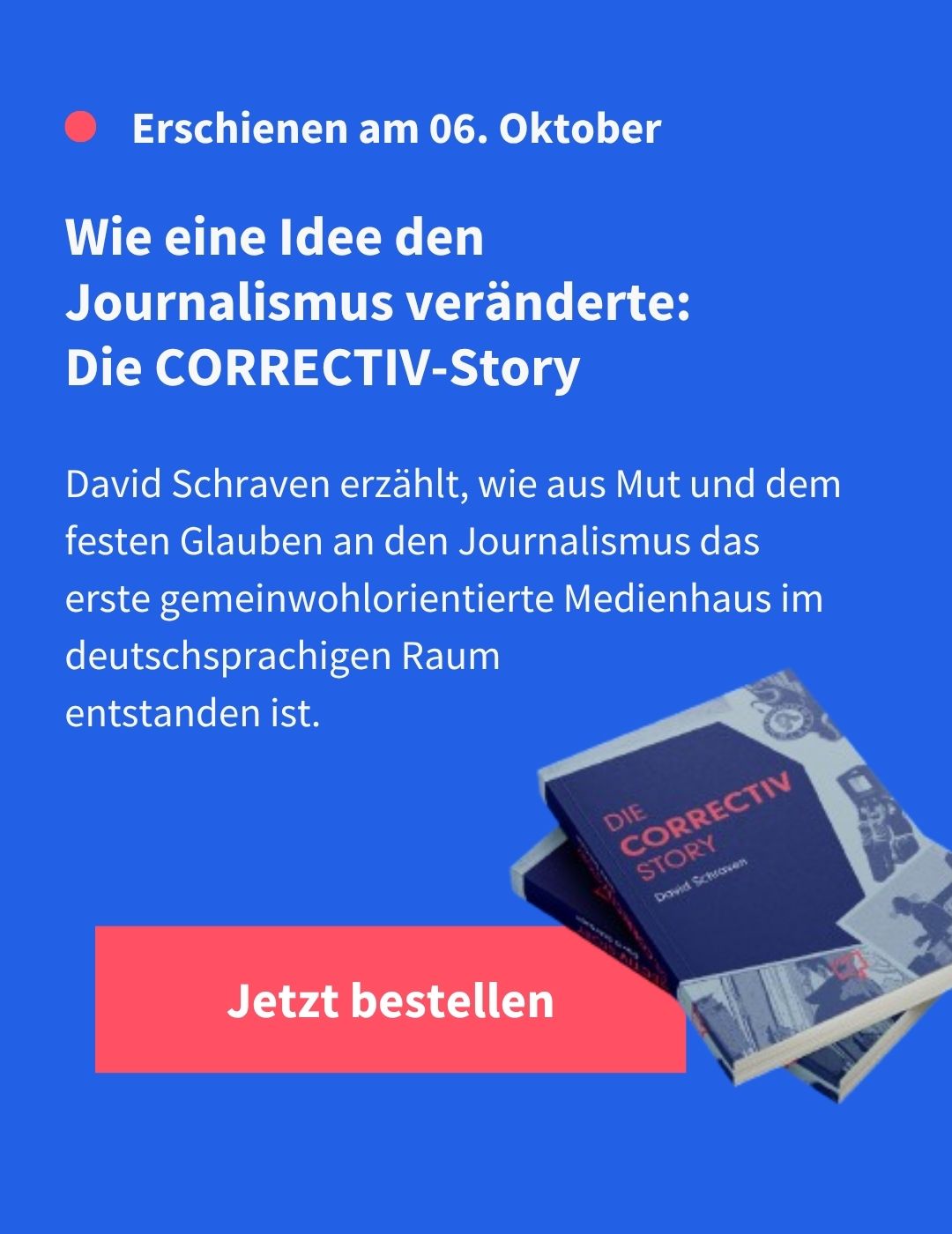 Vor über zehn Jahren habe ich CORRECTIV mit sieben Leuten gestartet. Heute arbeiten mehr als 180 Menschen bei uns. Wir sind mittlerweile das größte gemeinwohlorientierte Medienhaus im deutschsprachigen Raum geworden. Wir gehören zu den größten unabhängigen Neugründungen in Europa. Ich habe über diesen Weg nun ein Buch geschrieben. Es heißt: „Die CORRECTIV-Story“.