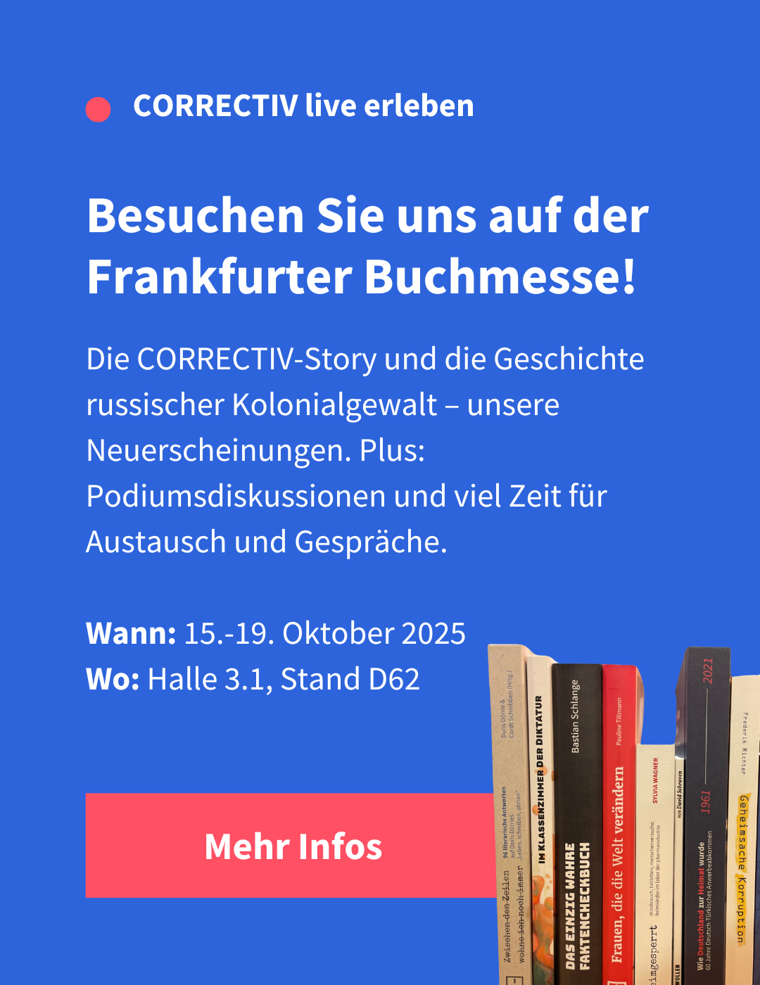 Auch CORRECTIV ist im Programm 2025 wieder vertreten. Neben dem Buchverkauf werden CORRECTIV-Journalistinnen und Journalisten in Form von Podiumsdiskussionen und Buchvorstellungen über Themen wie Demokratie, Populismus und Desinformationen diskutieren – aber auch über die Entstehungsgeschichte von CORRECTIV sprechen. Wann und wo: Freitag, 17. Oktober 2025 von 15:00 bis 15:30 Uhr in Halle 3.1 | D62.