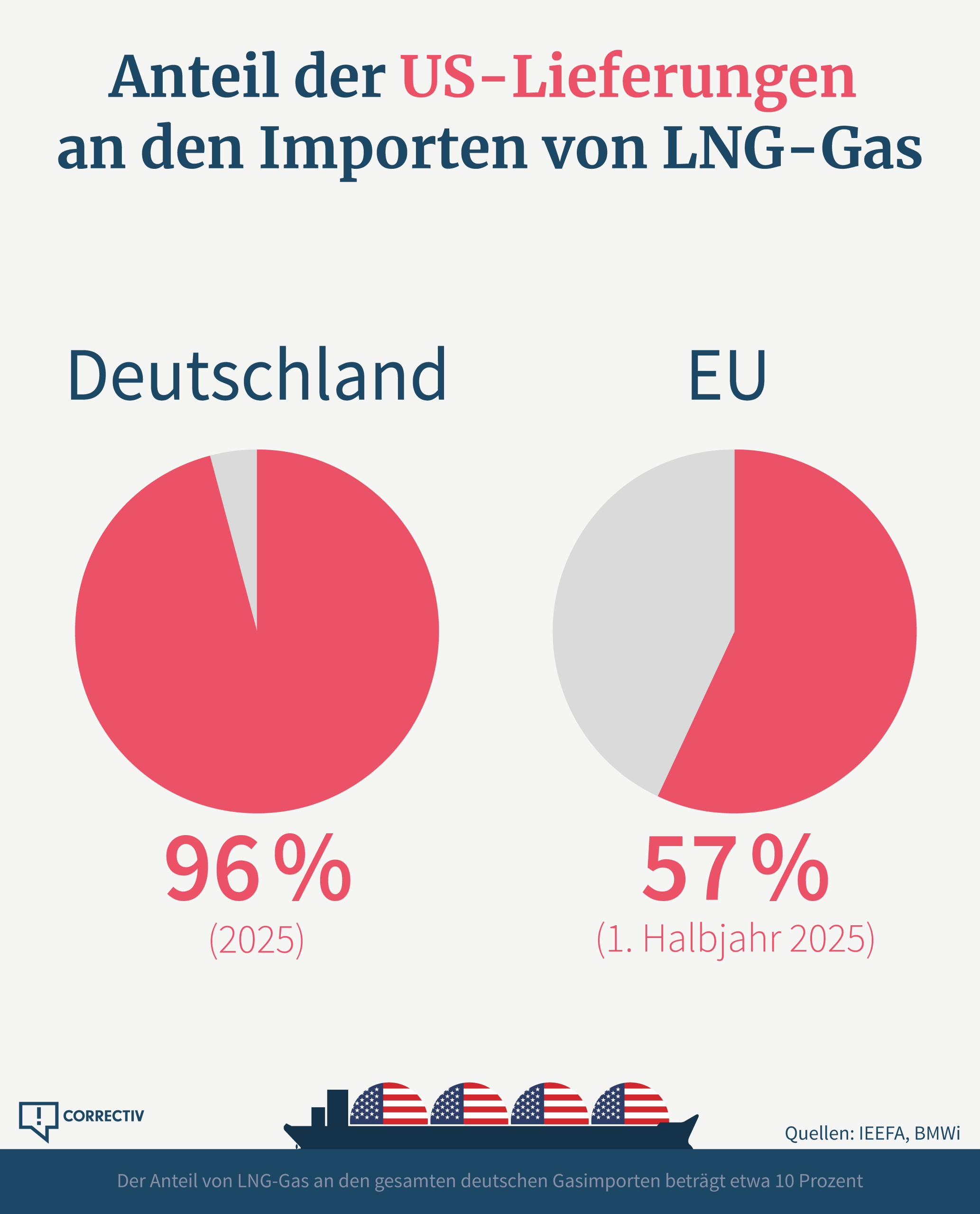 Von allem Gas, das Deutschland aus dem Ausland einkauft, kommen nur etwa 10 Prozent als Flüssiggas (LNG). Dennoch bereitet Fachleuten Sorge, dass fast die gesamte LNG-Menge aus den USA stammt. Denn Deutschland befindet sich damit in einer starken Abhängigkeit von den US-Lieferungen. Auch für die restliche EU ist die USA der größte LNG-Gas-Lieferant, der Anteil liegt bei knapp drei Fünfteln – allerdings ist er in den vergangenen Jahren kontinuierlich gestiegen.