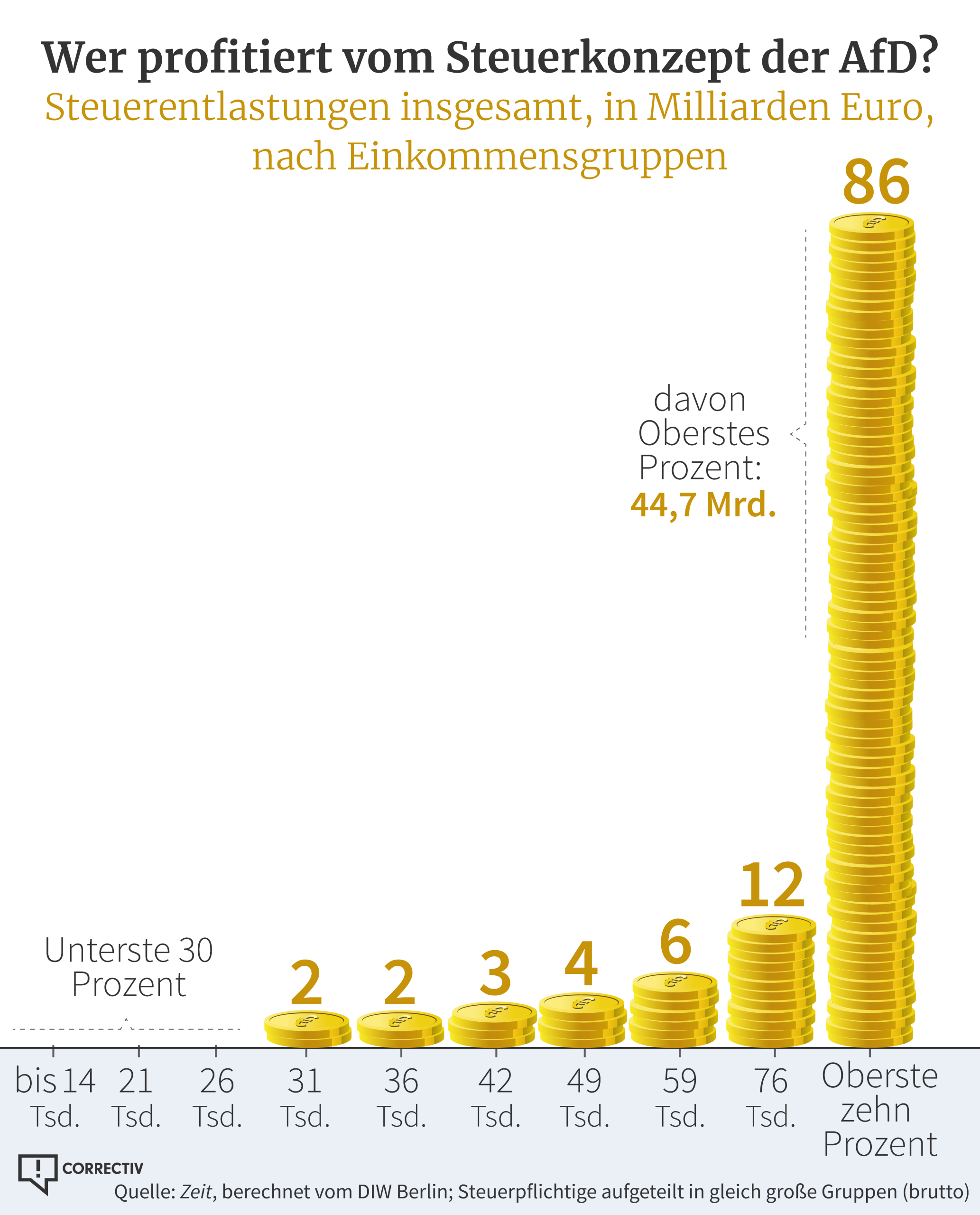 Die Bundestagsfraktion der AfD hat ein neues Steuerkonzept eingebracht. Es sieht Steuerentlastungen in Milliardenhöhe vor – allerdings vor allem für Besserverdienende. Der größte Profiteur wäre das Oberste Prozent der Einkommenspyramide, wie die Zeit auf Basis einer DIW-Analyse berichtet.