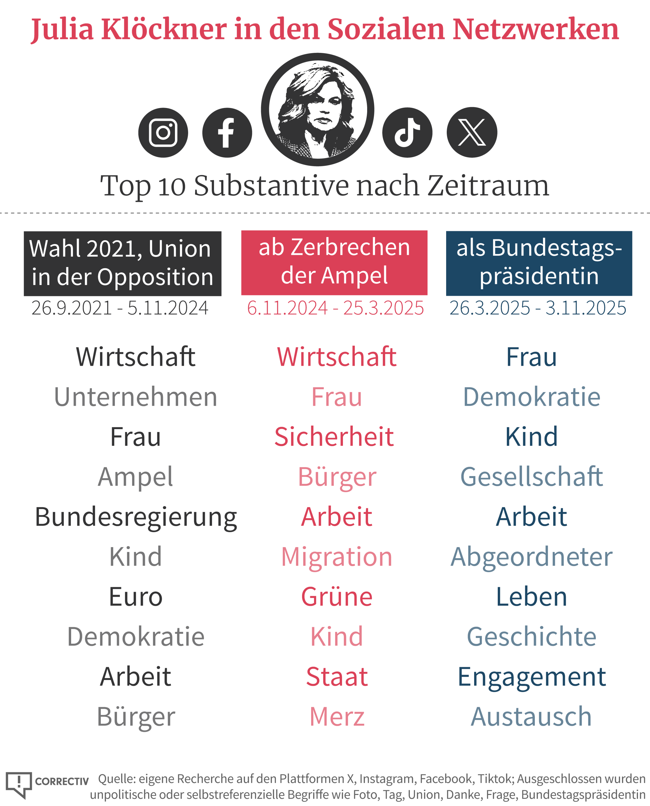 Julia Klöckner sorgt als Bundestagspräsidentin wiederholt für Diskussionen. Dabei gibt es sowohl Lob – etwa für eine klare Kante gegen Populismus im Plenum – als auch Kritik: Ist sie neutral und überparteilich genug? Oder steht sie für einen Kurs nach rechts? CORRECTIV hat sich genau angeschaut, was sich aus ihren Aktivitäten in den Sozialen Netzwerken über die Politikerin lernen lässt. Die Top-Begriffe ausgewählter Zeiträume zeigt die Grafik des Tages. Die ganze Recherche gibt es hier: