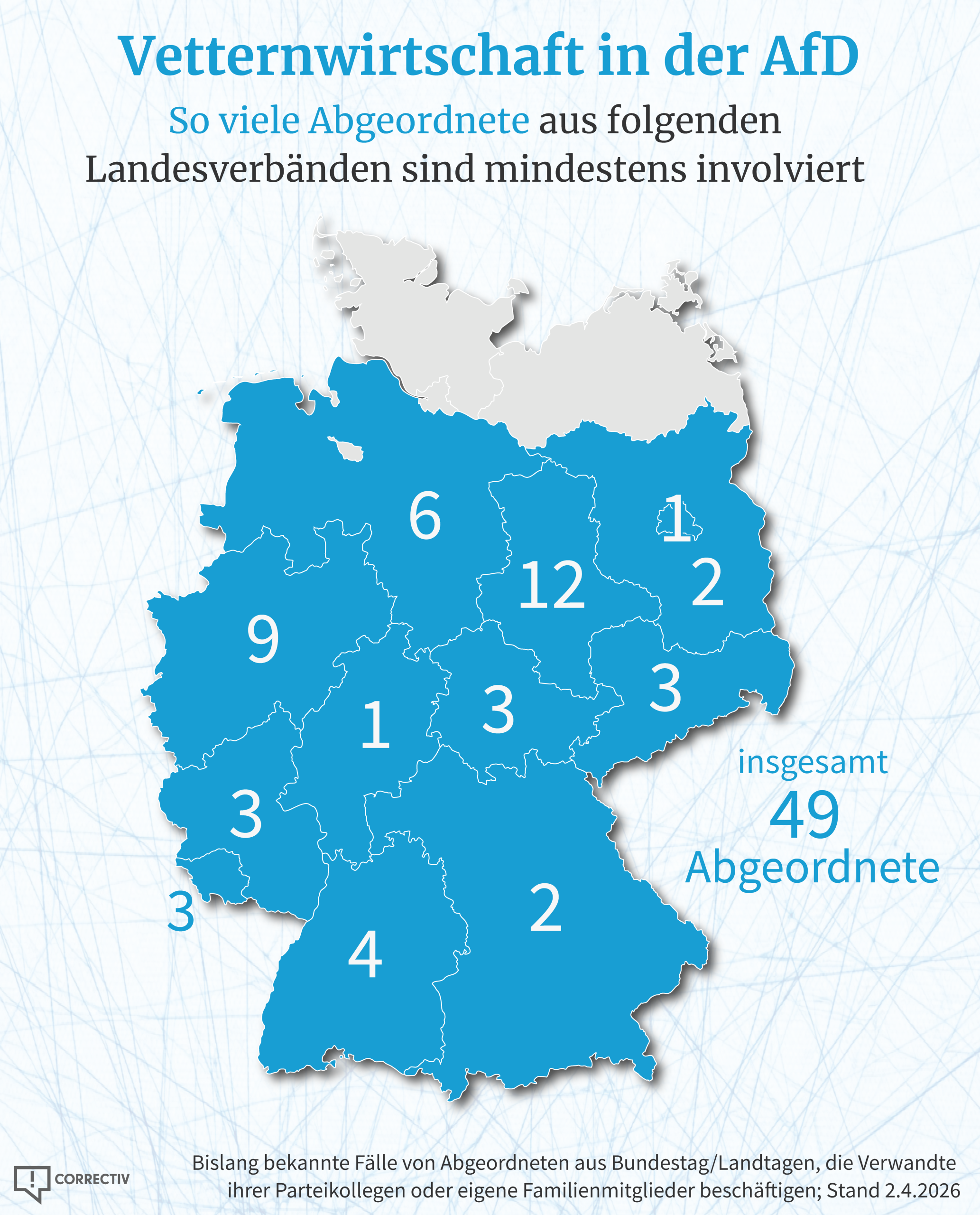 im März war es still geworden um die Vetternwirtschaft in der AfD – man hatte fast das Gefühl, als habe die Partei das unangenehme Thema erfolgreich „ausgesessen“, wie man in der Politik sagt. Unser Rechercheteam CORRECTIV.Sunlight ist allerdings stetig drangeblieben und hat den AfD-Vetternwirtschafts-Tracker mit dem schönen Namen „Family and Friends“ weiter aktualisiert. Per Klick aufs Bild geht’s zur Übersicht:
