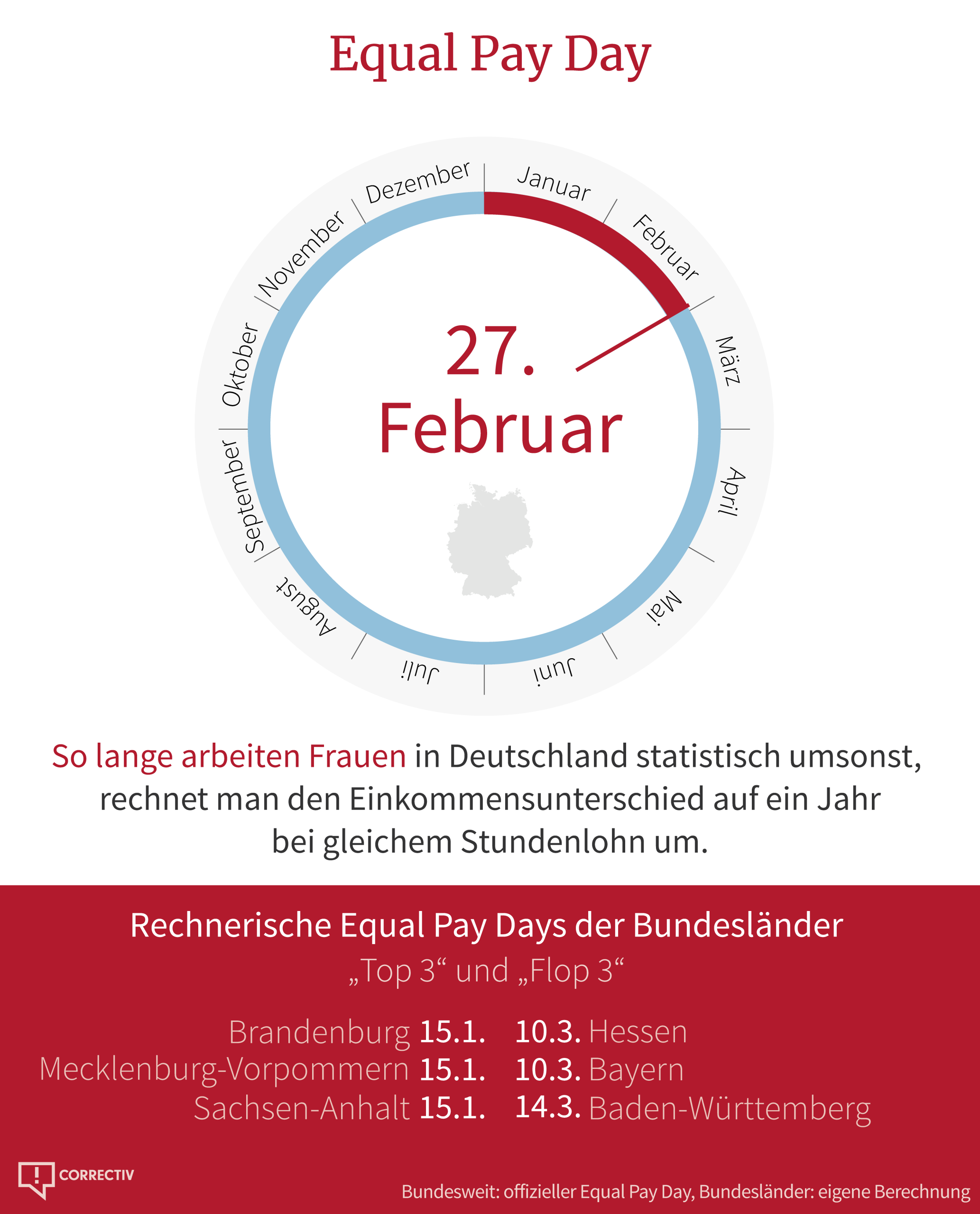 Heute ist der bundesweite Equal Pay Day. Rechnet man den Einkommensunterschied zwischen den Geschlechtern auf ein Jahr bei gleichem Stundenlohn um, hätten Frauen bis heute umsonst gearbeitet. Allerdings ist das nur ein Wert für das gesamte Land. Rechnet man diesen Wert für die Gehaltsunterschiede der Bundesländer aus, zeigt sich: Die Schlusslichter sind Baden-Württemberg, Bayern und Hessen. Die ostdeutschen Bundesländer schneiden deutlich besser ab.