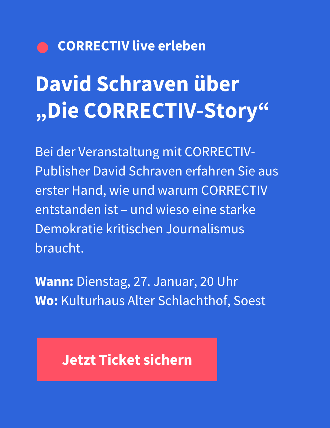 CORRECTIV ist das erste spendenfinanzierte Medium in Deutschland. Als vielfach ausgezeichnete Redaktion stehen wir für investigativen Journalismus. Wir lösen öffentliche Debatten aus, arbeiten mit Bürgerinnen und Bürgern an unseren Recherchen und fördern die Gesellschaft mit unseren Bildungsprogrammen.
