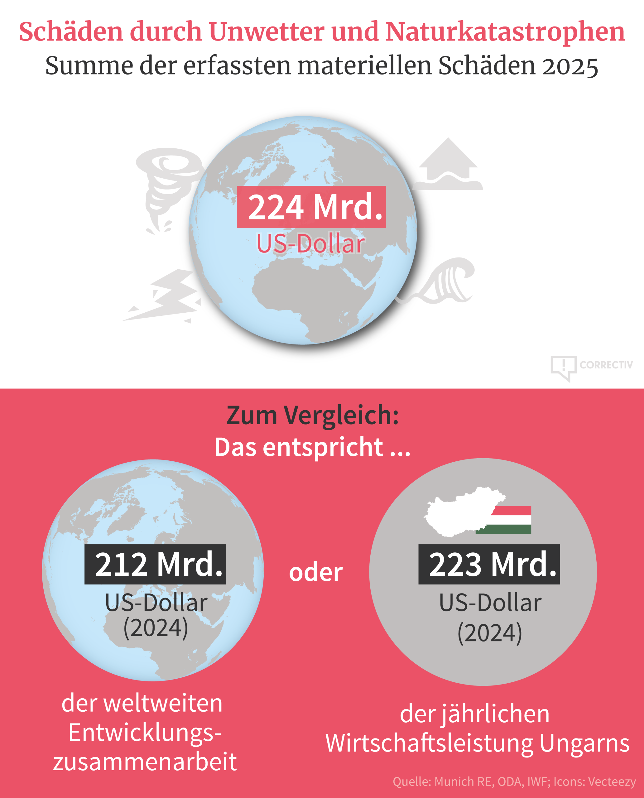 Auf 224 Milliarden US-Dollar beziffert der Rückversicherer Munich RE die weltweiten Schäden durch Unwetter und Naturkatastrophen. Das entspricht etwa dem Betrag, der weltweit jährlich für die Entwicklungszusammenarbeit ausgegeben wird.