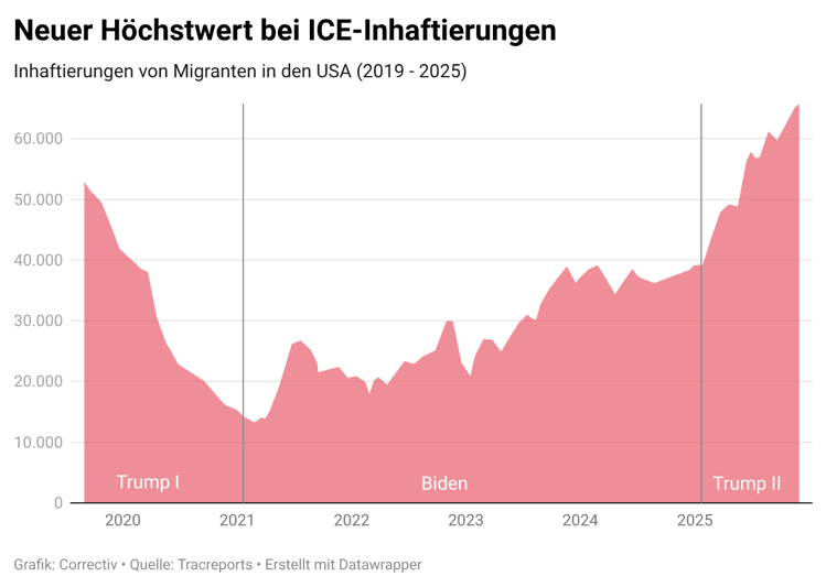Die US-Einwanderungsbehörde ICE verhaftet immer mehr Menschen. Behörden gehen davon aus, dass aufgestockte Steuermittel dazu führen, dass auch die Abschiebungen 2026 massiv ansteigen werden, auf 500.000. Das wäre mehr als je zuvor.