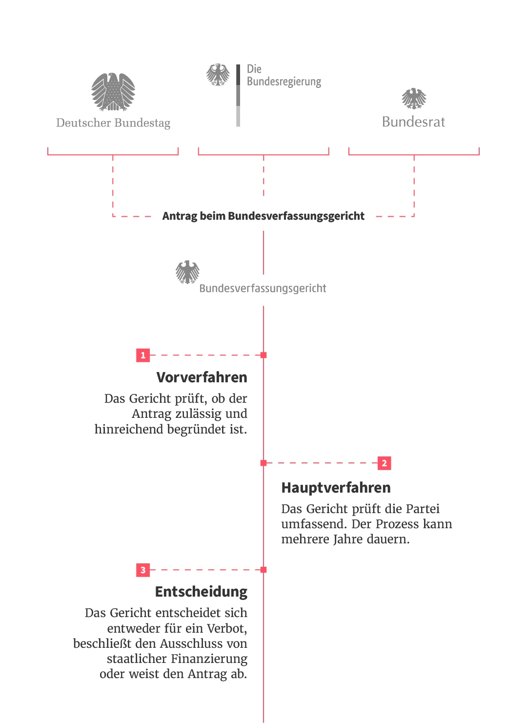 Einen Antrag für ein Verbotsverfahren können die Bundesregierung, der Bundesrat oder der Bundestag beim Bundesverfassungsgericht einreichen. Was spricht dafür, was dagegen – und wie würde ein solches Verfahren überhaupt ablaufen? Antworten auf diese Fragen sowie alle aktuellen Entwicklungen finden Sie auf dieser Seite.